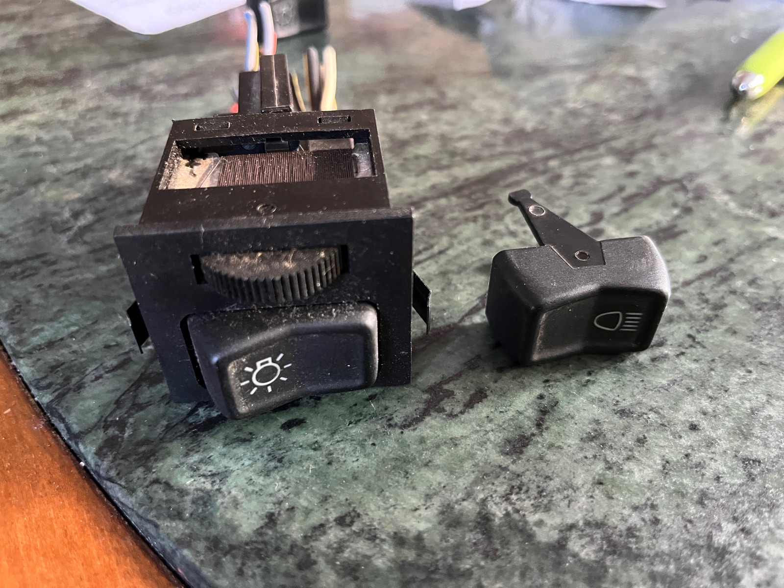 Weil ich auf der Suche nach einem Fehler der LWR (Leuchtweitenregulierung) bin, habe ich heute den defekten Lichtschalter zerlegt, gereinigt und wieder zusammengebaut.