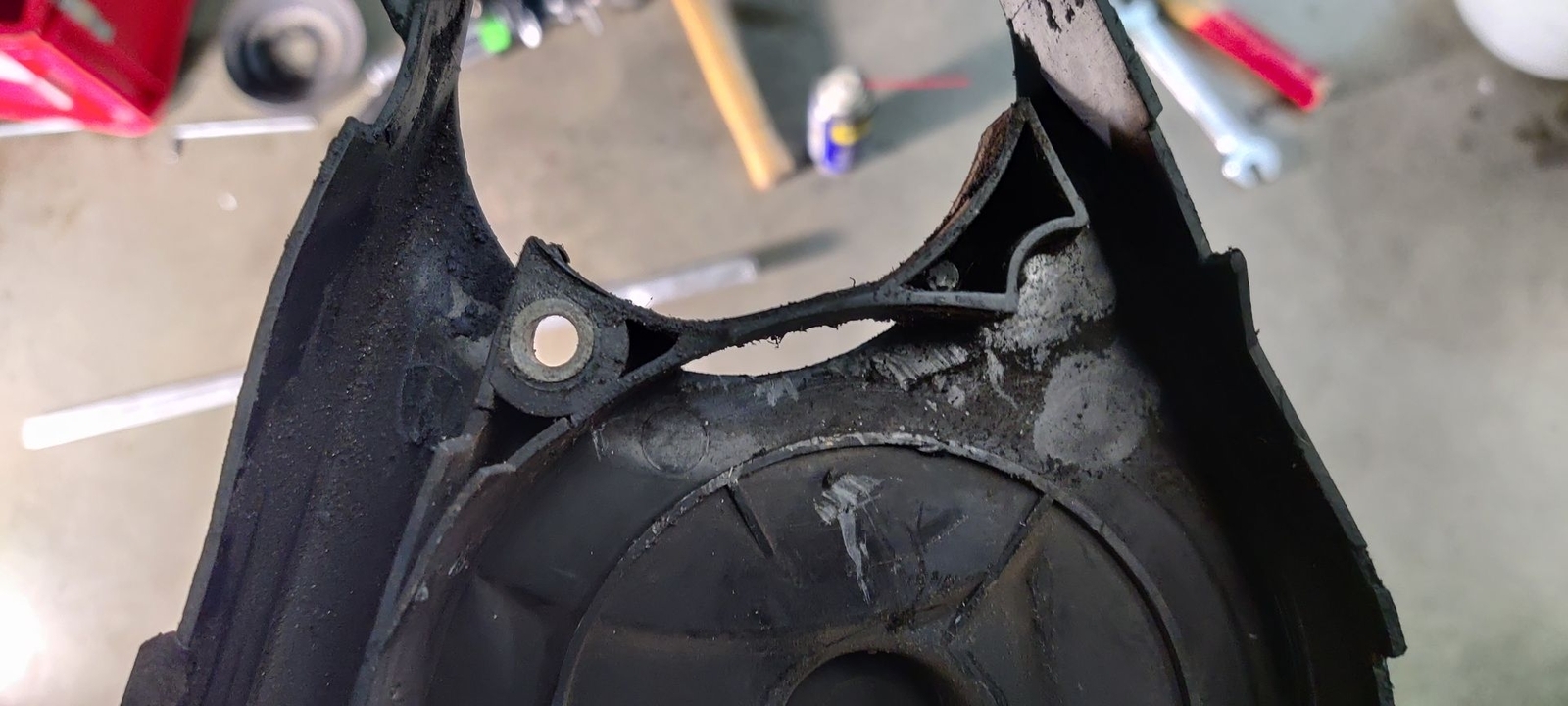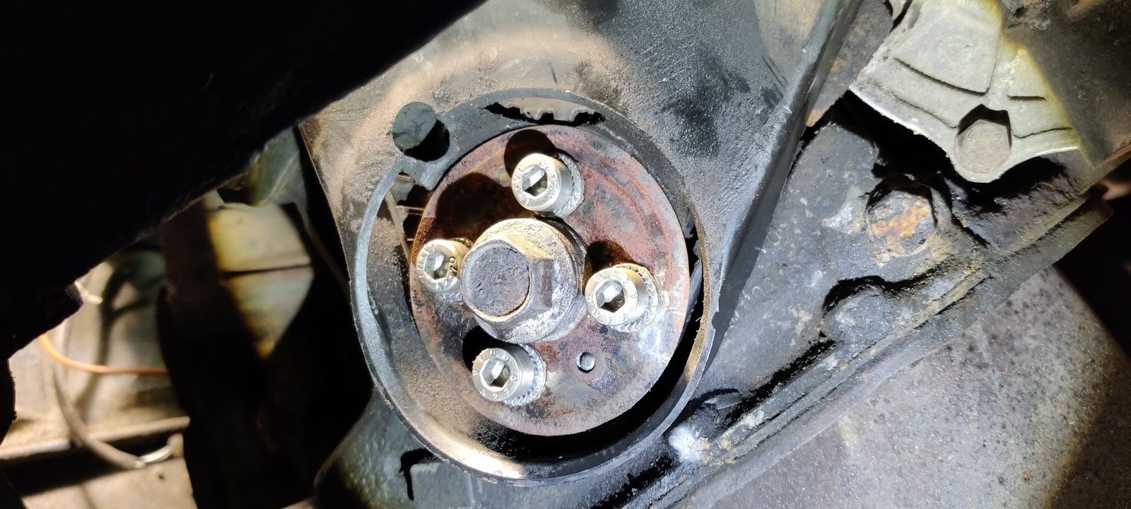 die vier Inbusschrauben dürfen müssen noch weg. Dann auch das Blech, oder die Scheibe vor dem Kurbelwellenzahnrad.