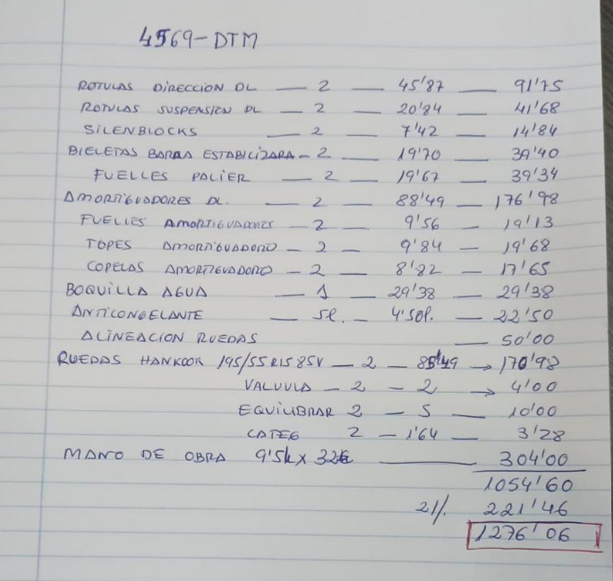Nur mal kurz zu Preisen hier in einer spanischen Seat-Werkstatt. Bei einem Bekannten von mir muss quasi die ganze Vorderachse neu plus 2 Reifen, er dachte, nur die Spur sei verstellt. Man beachte den Stundenlohn von 32 € :rolleyes: