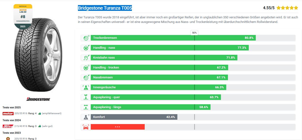 • Beim Reifentest bin ich auf den Bridgestone Turanza T005 gestoßen. der schneidet sehr gut ab;