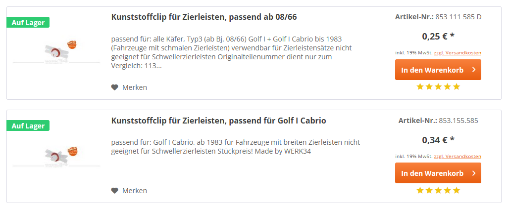 Ich kenne nur die für die Zierleiste oben und die etwas größeren für die Leiste am Schweller . Die waren meiner Meinung nach oft Orange und nicht Weiß.