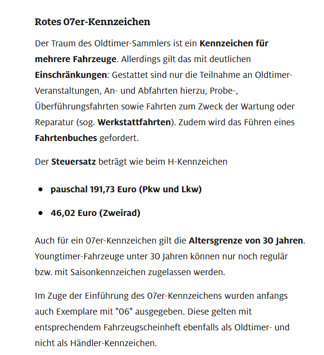 Macht eigentlich nur für einen Sammler Sinn, der seine Fahrzeuge nicht Als solche betrachtet, sondern nur ansehen will, denn die Einschränkungen sind schon sehr enorm, ausserdem wird das Sonderkennzeichen im Ausland nicht anerkannt, wenn auch manchmal geduldet.