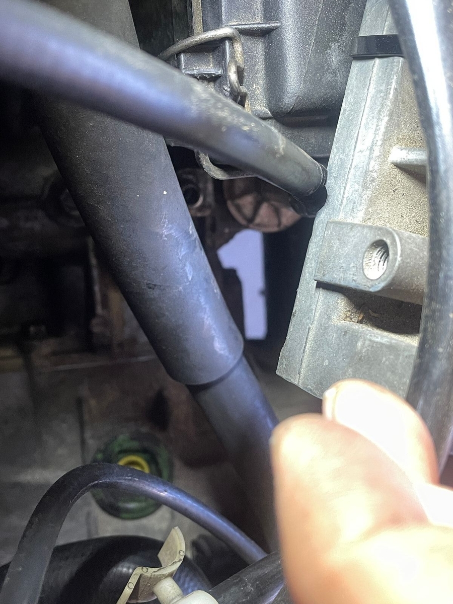 Jetzt habe ich gesehen, daß das Seil eigentlich zu lang ist und am Gehäuse des Luftmengenmessers scheuert bzw. sich da im Laufe der Jahre eingearbeitet hat, siehe Bilder:
