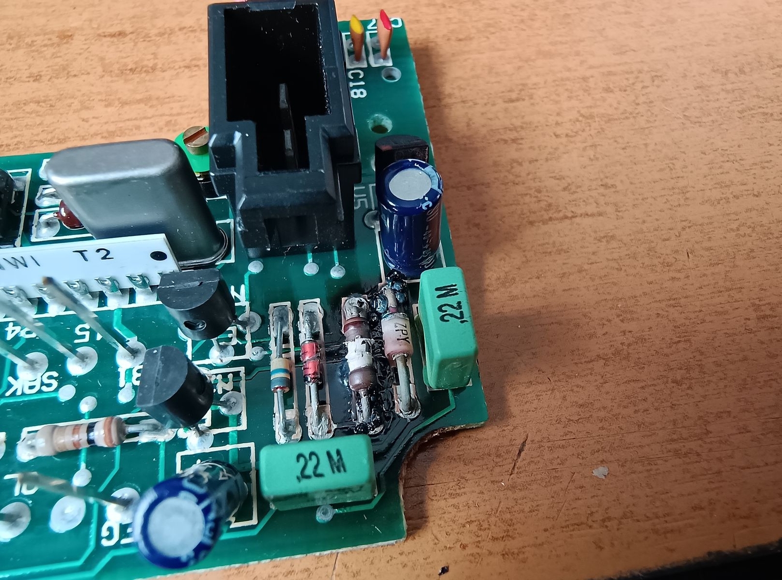 Nun hat die blaue Folie ein kleines Loch weil ein Widerstand durch ist, und auf der MFA Platine ist Widerstand und Zenerdiode abgefackelt.