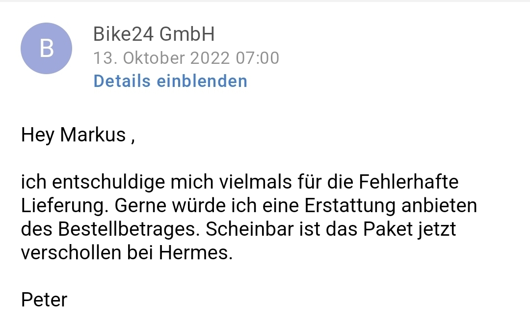 Da stand eben ein Mensch vor unserer Pforte und überreichte mir einen Karton der lt. Händler und Hermes verschütt gegangen ist...
