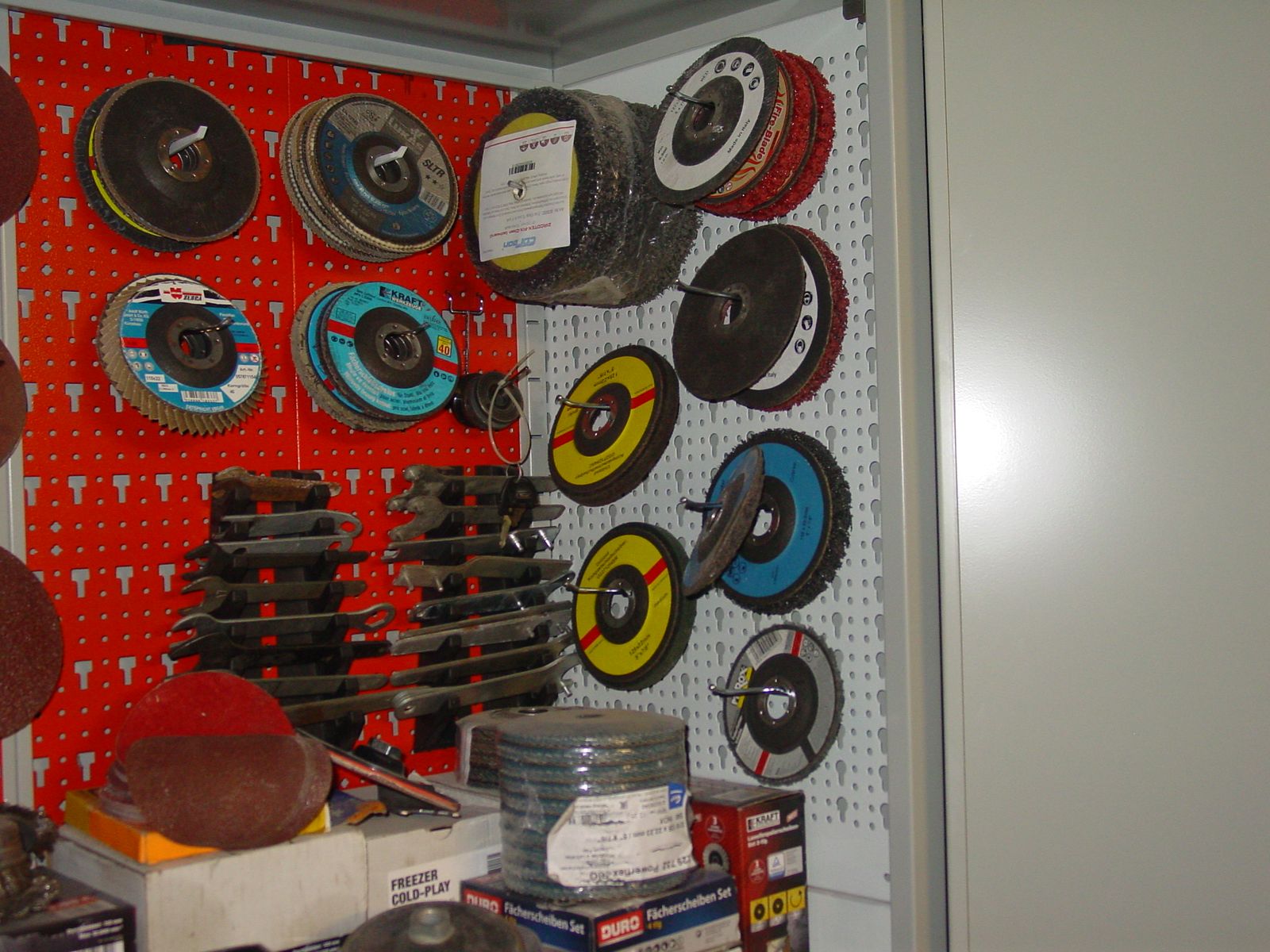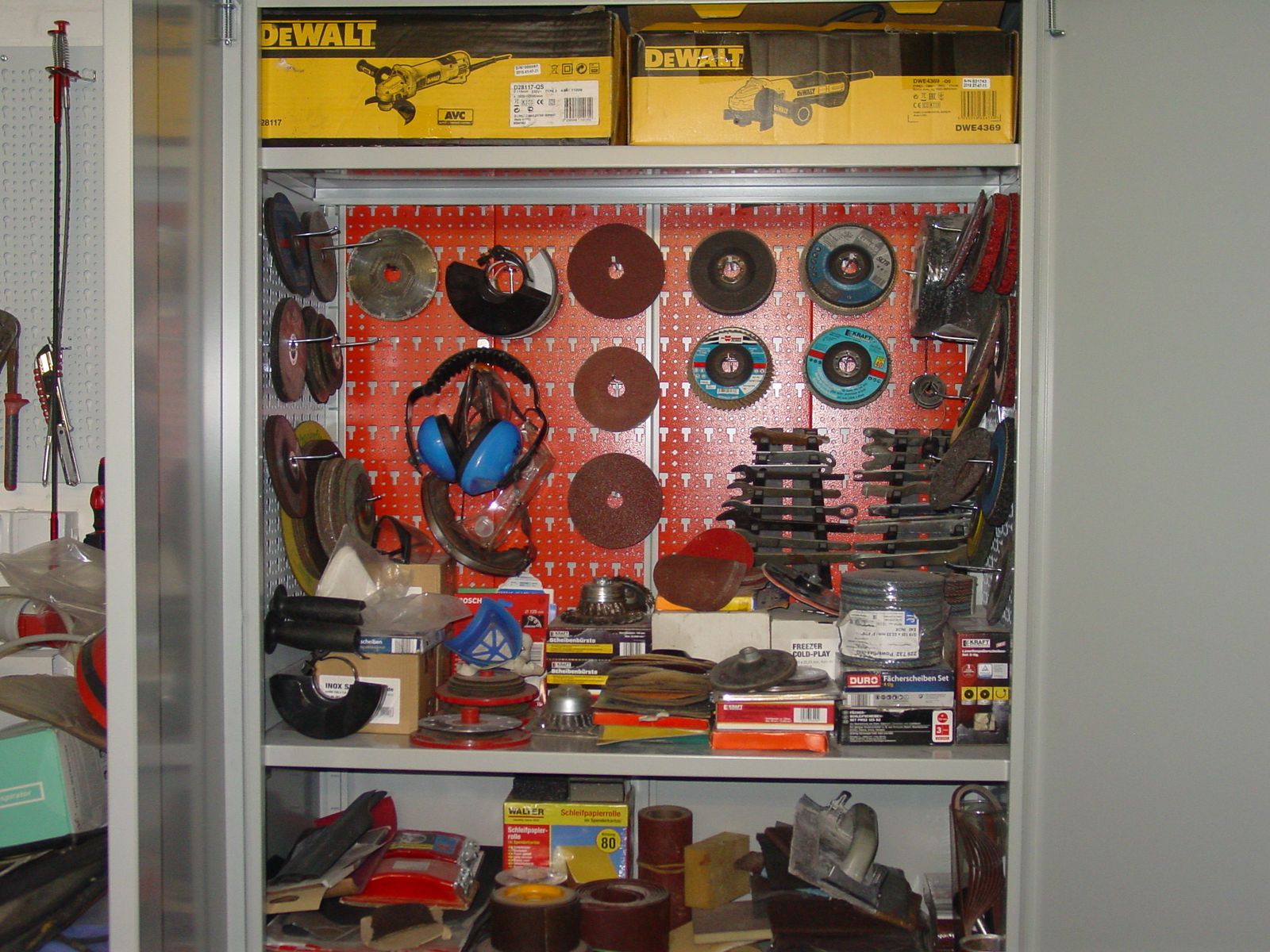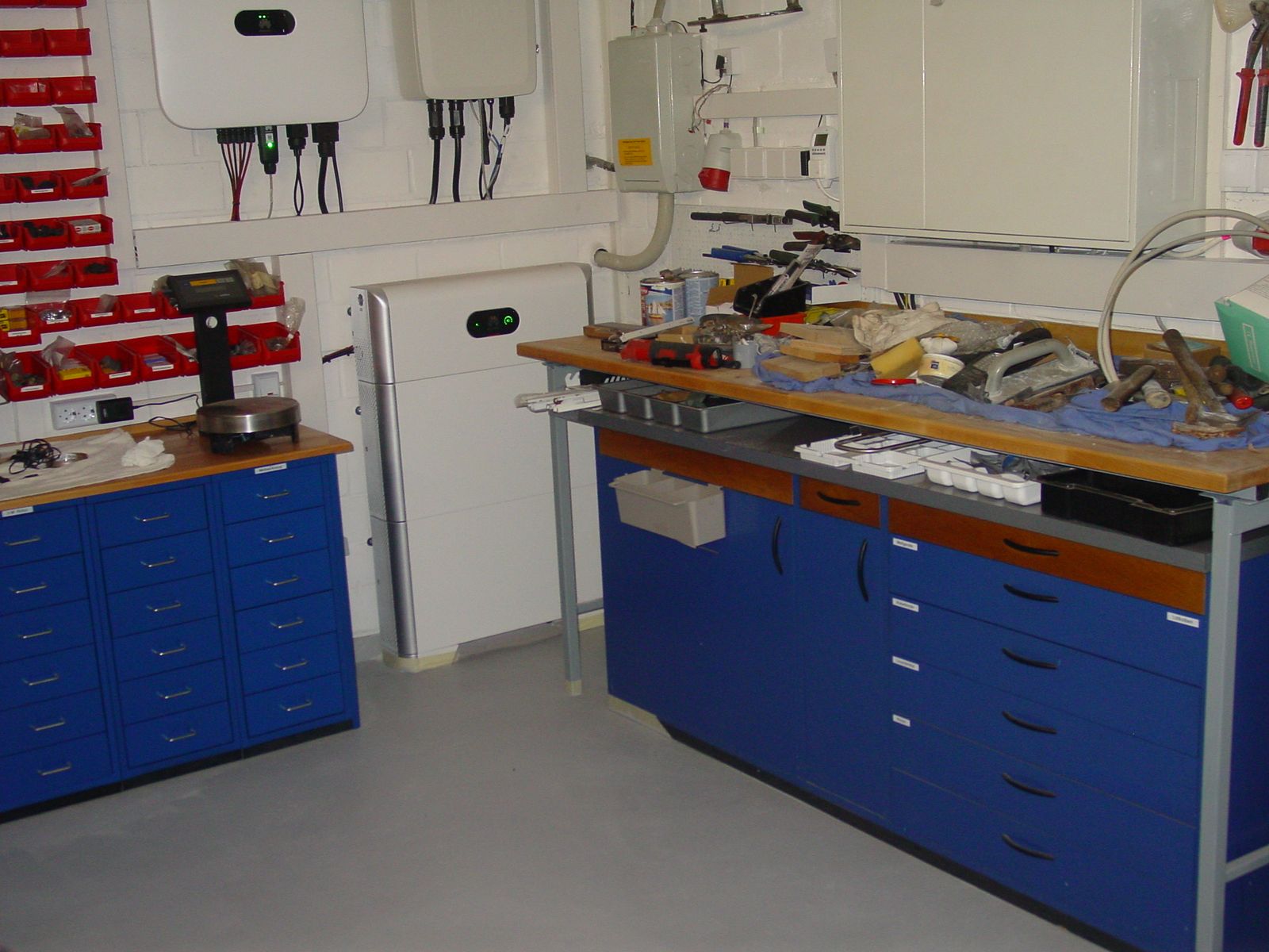 Das, was auf den Arbeitsflächen aktuell noch rumliegt, wurde gerade noch gebraucht (Kabel, Steckdosen, Beschriftungsgerät, Holzöl samt Pinsel...) oder muß noch in die leeren Boxen einsortiert werden.
