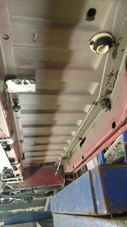 Der Unterboden wurde gekärchert um den groben Dreck zu entfernen, Bodenschutz und diverse Schichten Wachs wurden beim Strahlen entfernt.
