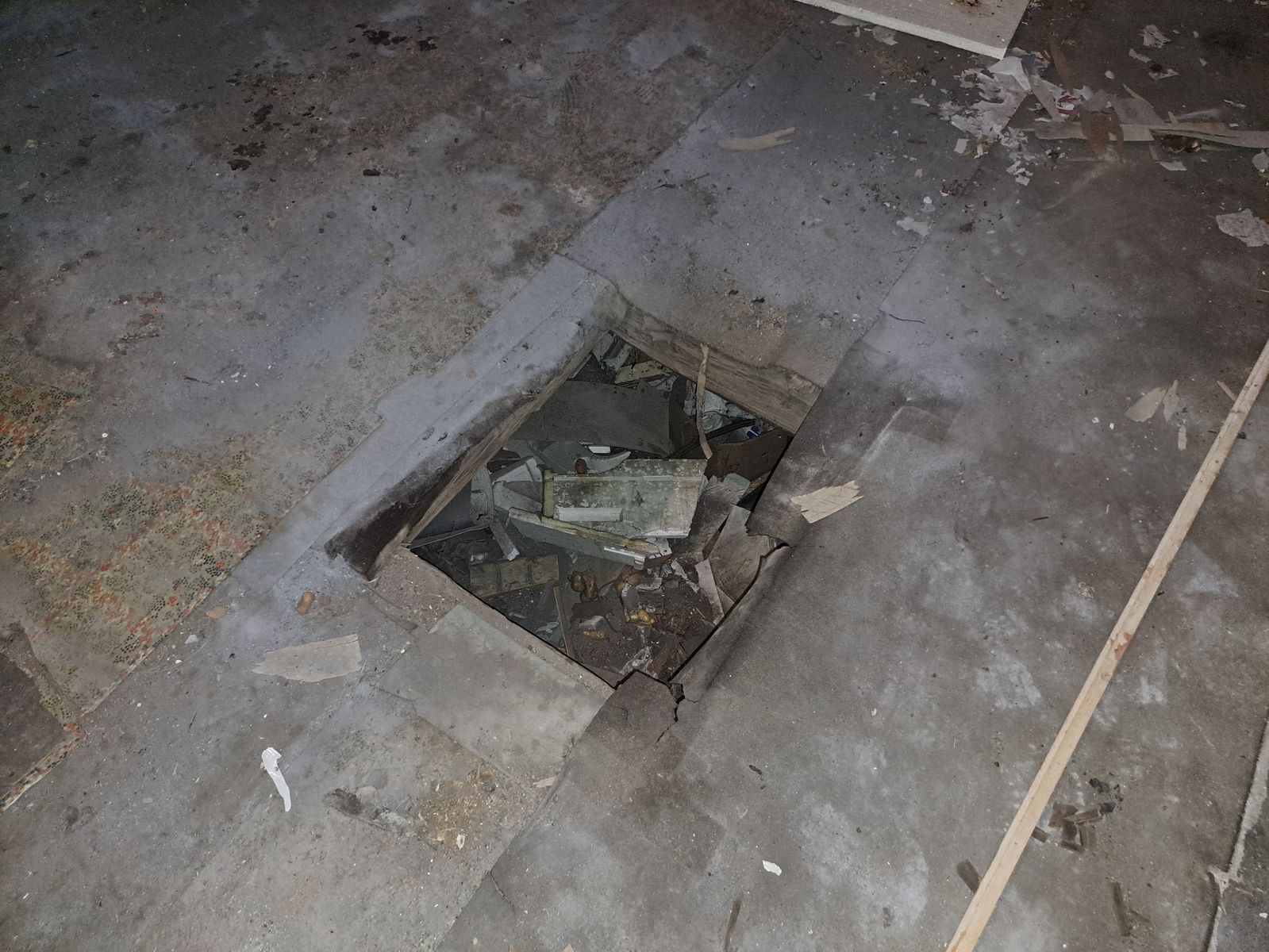 Das Gebäude ist eine uralte Scheune die mal zu einer Lackiererei umgebaut wurde. Da unten ist ein vergessener Hohlraum. Da hat der Erbauer damals seinen ganzen Müll rein geschmissen und anschließend einen Teppich drüber gelegt.