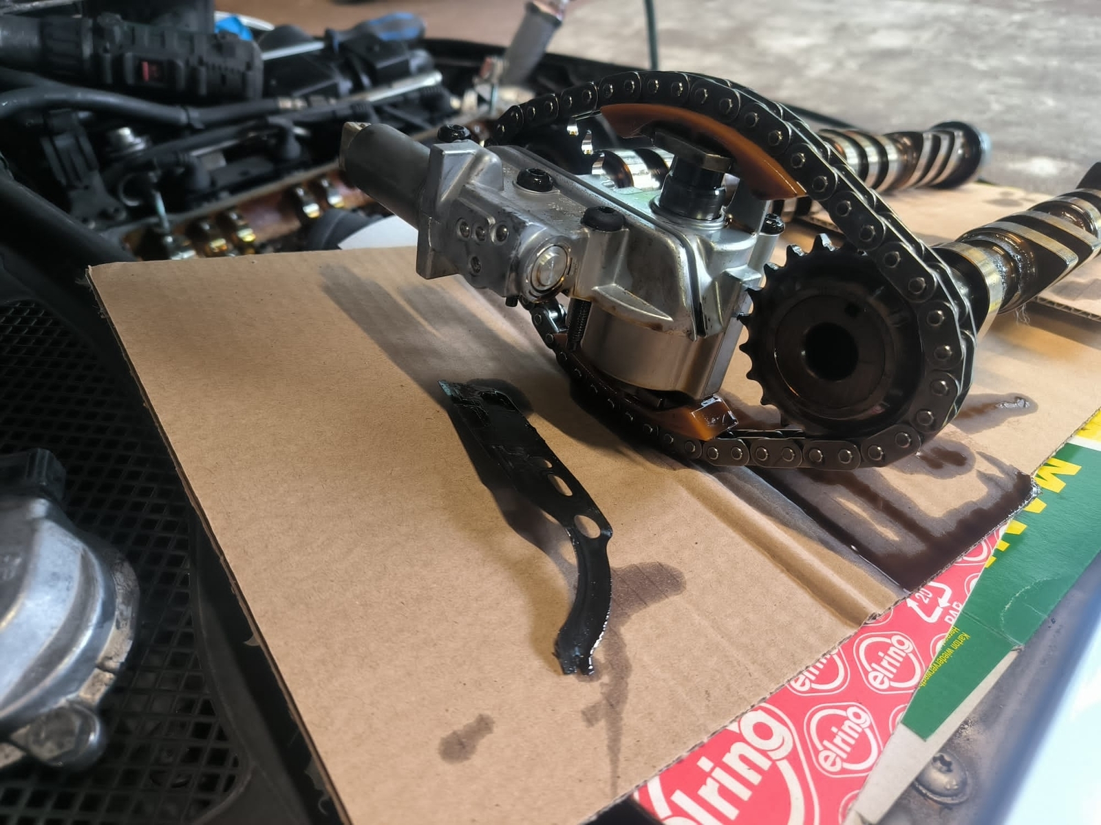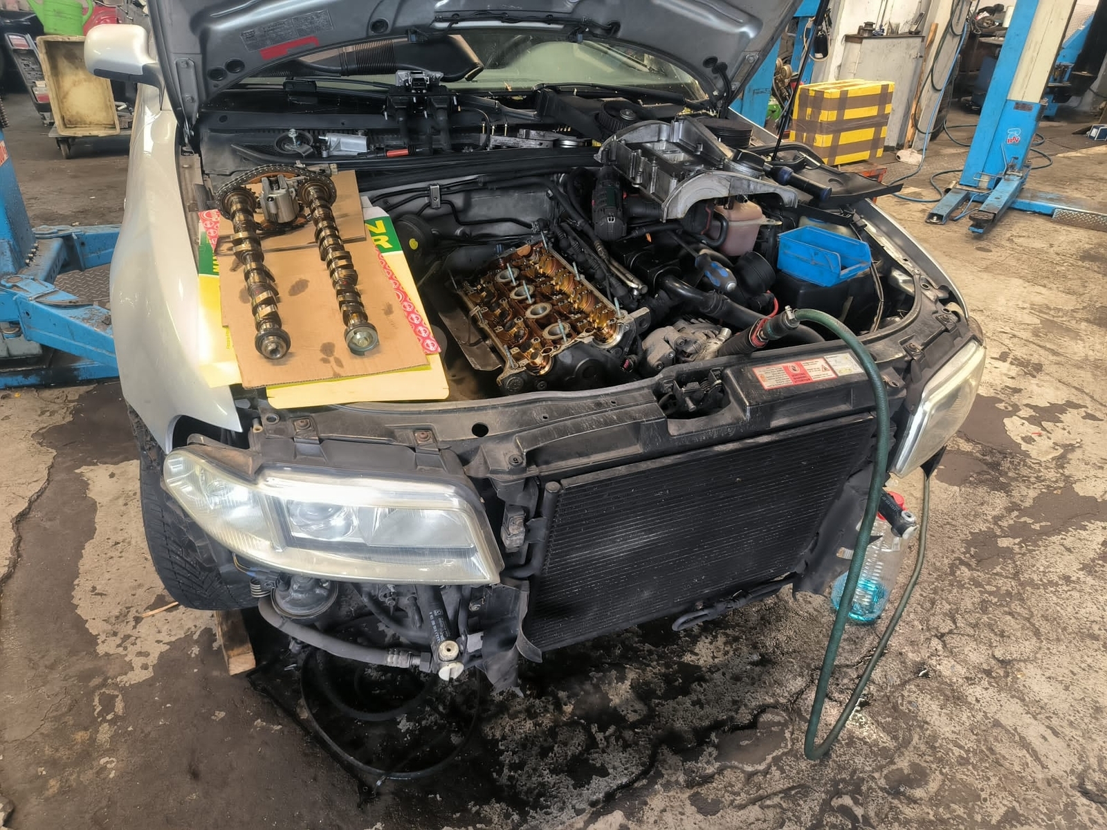 Der Haupt-Übeltäter der Undichtigkeiten war der Dichtring vom Öl/Wasser-Wärmetauscher - also typisch Golf 1 Cabrio 2H und Konsorten - alles das gleiche Zeugs. Dann der Nockenwellen-Versteller - endlich mal etwas wo man sich bei konzentrieren muß. Original bei Audi für über 900 Tacken - hab ich durch Vitamine für 300 bekommen - um Längen besser als das Febi-Ding was es noch als einzige Alternative gibt. Dann die Ölwanne - das Öl was sich dort sammelte kam nicht ausschließlich von oben - man konnte eine gewisse Eigen-Inkontinenz erkennen. Dann das Riemen-Zeugs - alles raus - alles neu - wenne schomma dabei bist dachte ich mir - machste wie immer keine halben Sachen. Natürlcih konnte man dann erkennen das auch der Kurbelwellen-Ring als Ölstopper nicht mehr wirklich geeignet war.