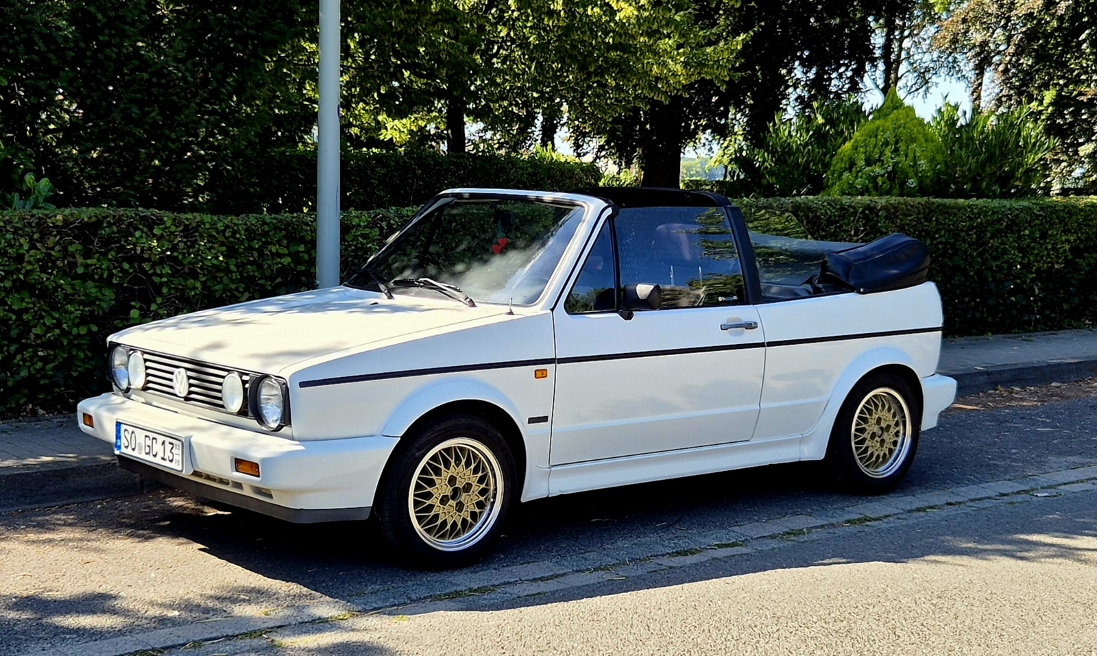 Sehr erfreulich war heute das Oldtimer-Treffen in 47589 Uedem an der Hohen Mühle, also gut 20km von uns zu Hause. Hingefahren sind da von unserer Seite ein 1er-Pirelli-Golf, ein Einser mit 1,9l und Weber und wir mit dem Cabrio. Es waren viele viele Autos da, der Platz war schon eine halbe Stunde vor dem eigentlichen Beginn voll und alle, die später kamen, mussten auf eine "Ausweich-Wiese".