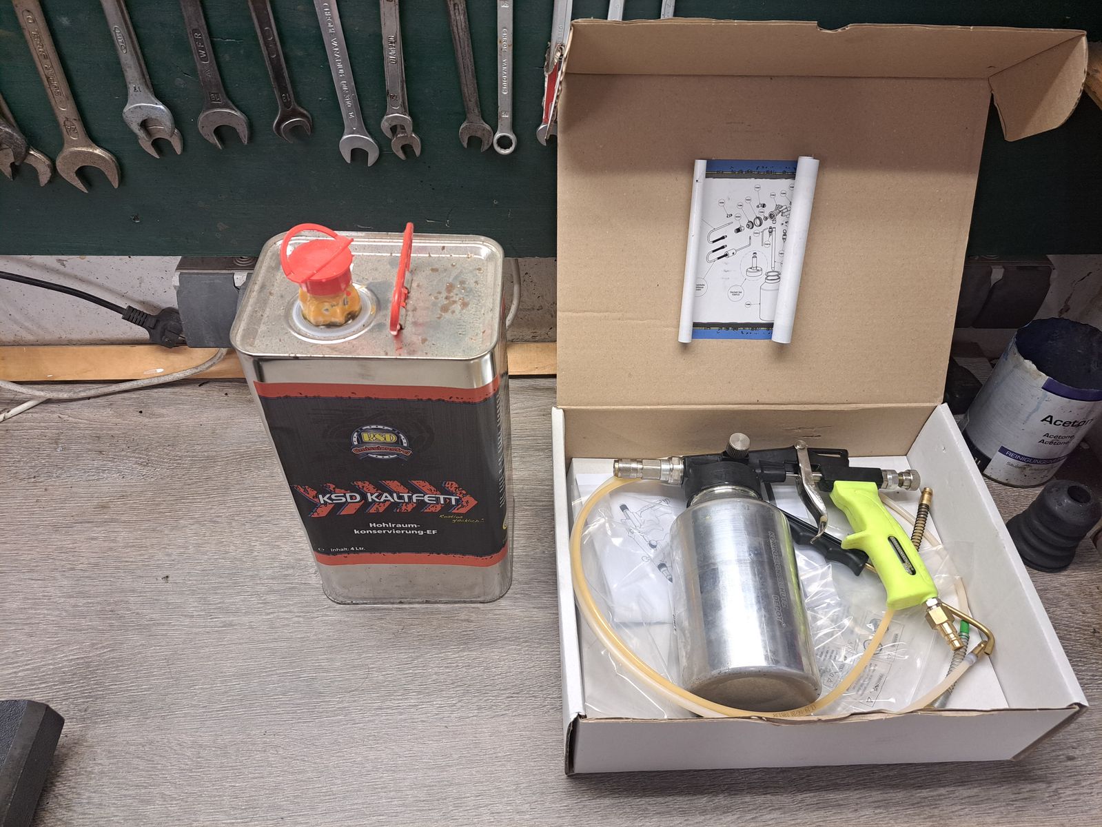 Am Ende hab ich noch eine Große Dose Hohlraumwachs und die Druckluftpistole ausgeliehen bekommen.