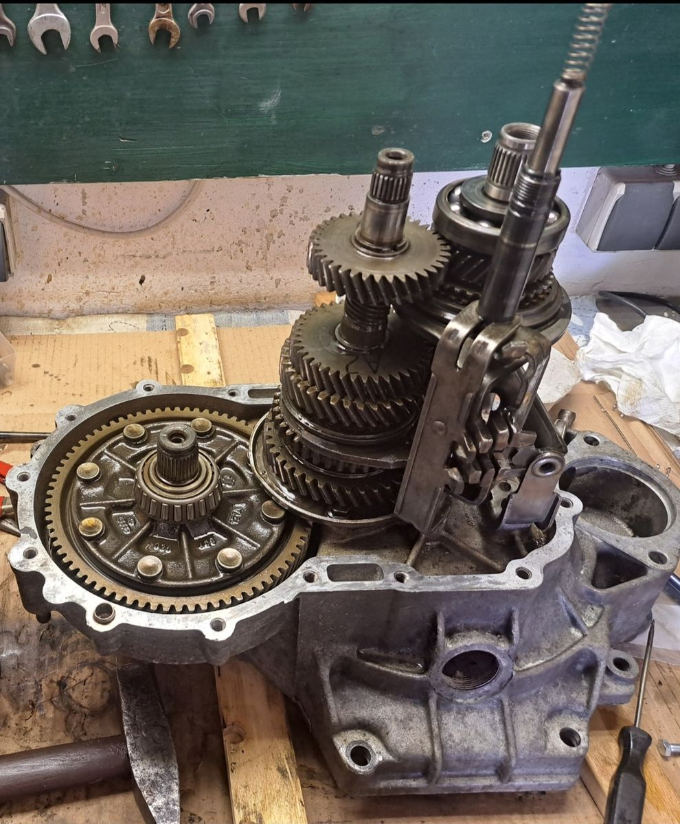 Die Schaltwelle (gelb) so lange drehen bis der gesamte Arm nach oben abgedreht ist. Er sitzt nur auf dem Gewinde.