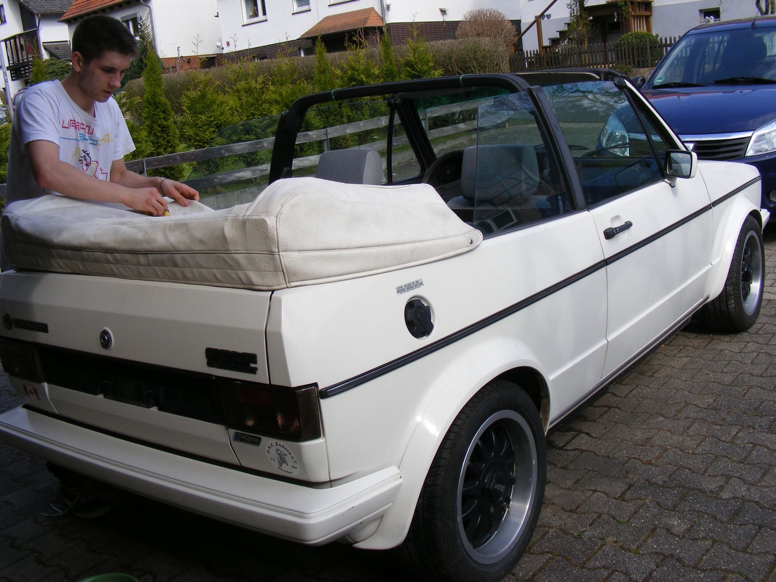 richtig heiße ich Achim und komme aus Melsungen . Hatte mir 1993 einen weißen golf 1 Cabrio gekauft als reines Sommer Fahrzeug was er auch in Zukunft bleiben wird . Im Jahr 2001 habe ich ihn in sein Dornröschen schlaf versetzt zwischen durch mal immer nach der rechten geschaut und weiter schlafen lassen . habe ihn nun aus sein schlaf erweckt und bin zur zeit dabei ihn so langsam wieder ins leben zu holen . dadurch das er nie im Winter im Einsatz war ist das mit Rost kein Problem . habe inzwischen bremse vorne hinten mit neuen Bremsschläuchen neu , neue Querlenker mit allen Gummis und Spurstangen neuer tank neue Benzin pumpe und Druck Speicher . Also von unten alles wieder gut nun geht es an den Rest neues Dach muss drauf Motor ist fast fertig bin aktuell einen Mengenteiler zu überholen . innen wieder schön sauber machen . ziel ist es das er nächstes Jahr wieder auf die Straße kommt . Da ich in jungen Jahren viel an diesen Autos geschraubt hatte (5 Einser Scirocco ein Zweier Scirocco und ein Einser Golf GTI ) gibt es nicht viele schrauben die mir unbekannt sind . hatte in den letzten Jahren mit unseren Sohn eine Audi 80 Cabrio und ein Audi 80 b4 wieder ins leben zurück geholt und auf die Straße gebracht . Als alltags Auto fahre ich einen Dacia Spring günstiger kann man kein Auto fahren.