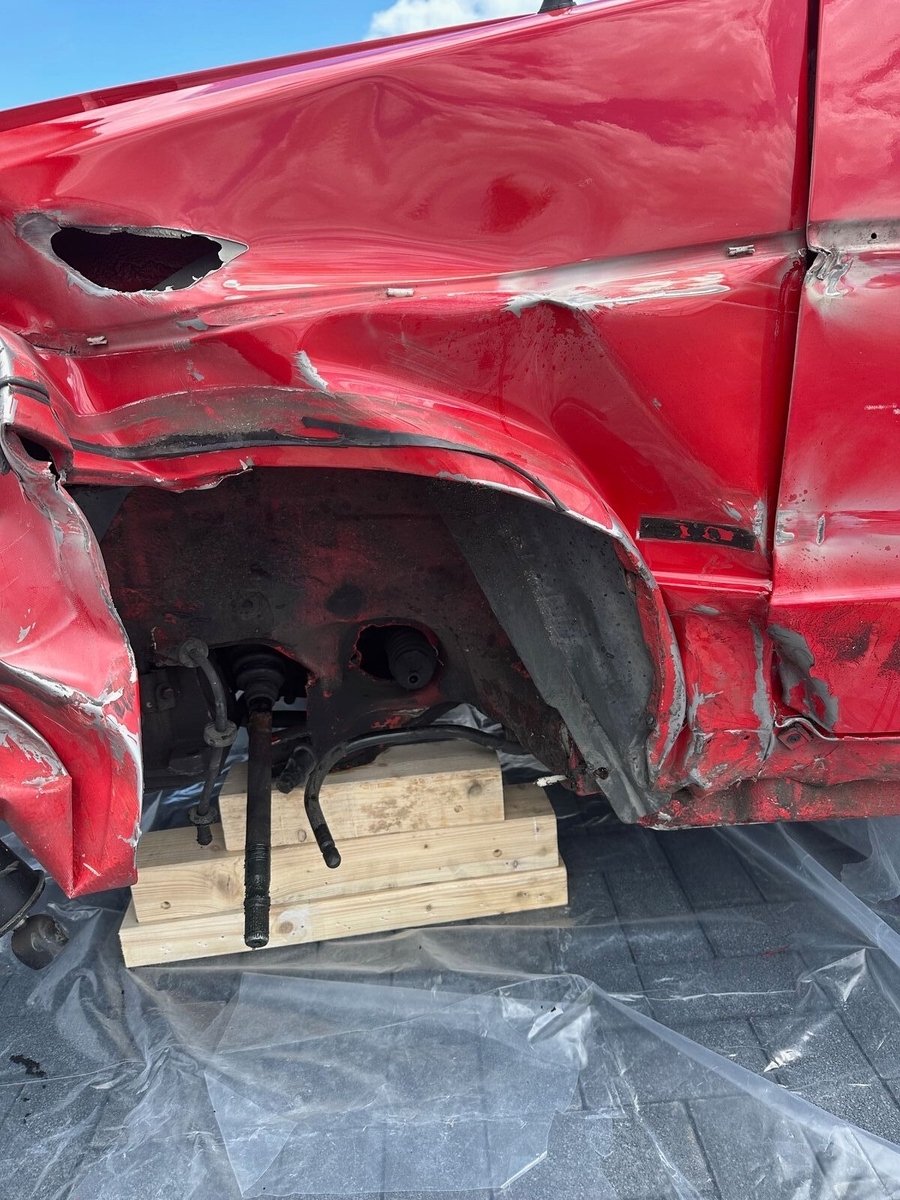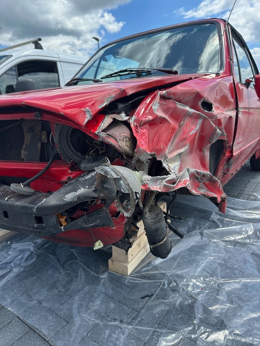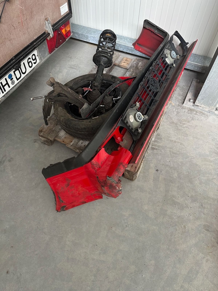 Vorderrad einschließlich Achsschenkel und Stoßdämper rausgerissen, Front und Fahrerseite, Kotflügel, Haube, Scheibenrahmen kaputt, Getriebe lässt sich nicht mehr in den Leerlauf bringen.