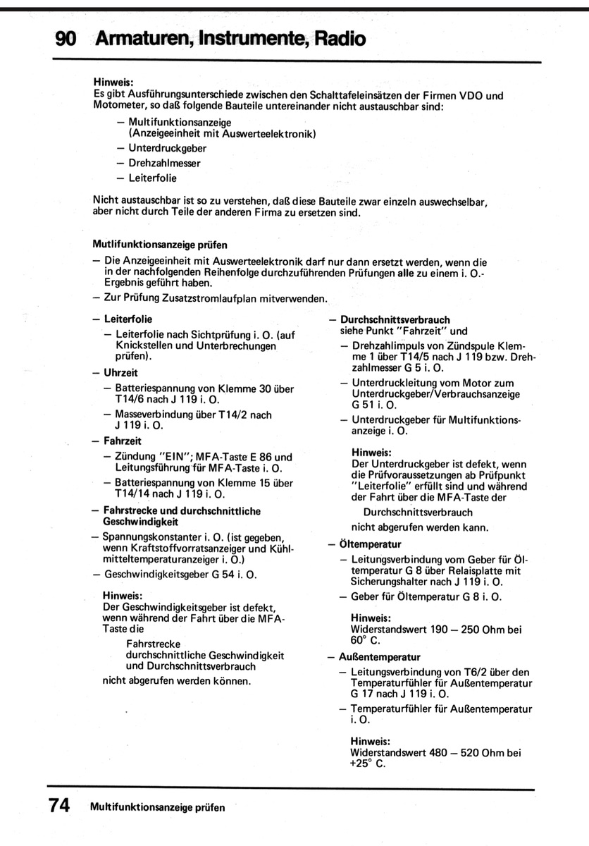 Was ich gefunden habe: Bei 60 Grad muss der Fühler 190-250 Ohm haben (finde die Angabe sehr grob). Die MFA wird auf Anzeige 60 Grad mit 227 Ohm getestet, also je näher der Fühler bei 60 Grad davon ist, desto besser. Umgekehrt kannst Du die MFA mit einem 227 Ohm (+- 3 Ohm) Widerstand testen. Einfach zwischen die beiden Leitungen oder zwischen Masse und Einzelleitung stecken und schauen, ob die MFA 60 Grad anzeigt.