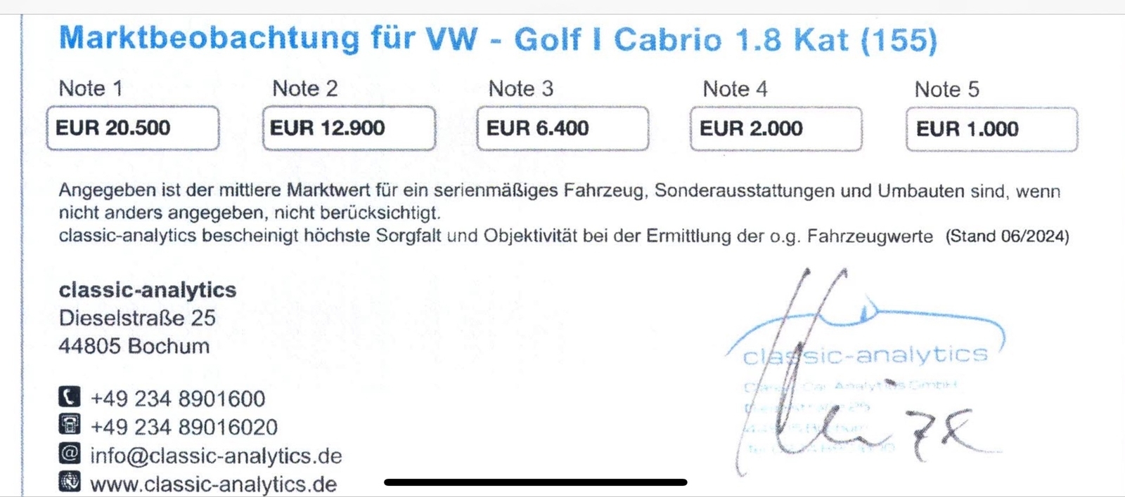 ich habe die Gelegenheit, ein Golf 1 Cabrio Baujahr 1984 US-Modell zu erwerben. Genau Ausstattung weiß ich leider nicht, zumindest hat er Ledersitze und soll wohl der 1.8 90 Ps Motor sein.