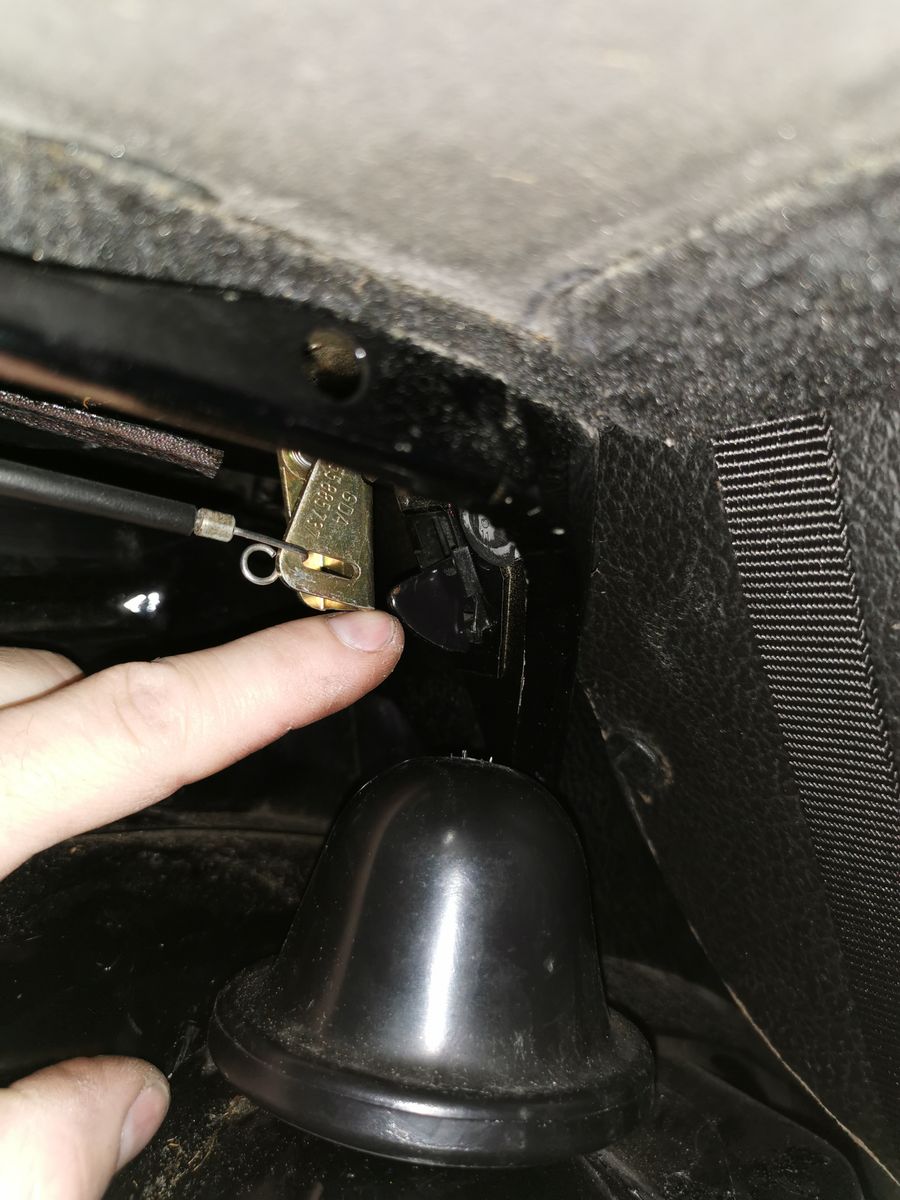Mit gefummel bekommst du die Rückbank entriegelt. Dann die Hutablage nach oben,am Deckel die Pappe weg. Wahrscheinlich ist die Verbindungsstange raus.