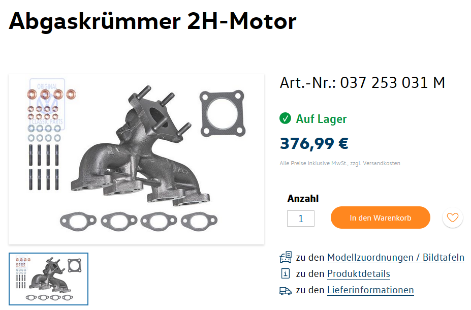 Krümmer, Abgasanlage für VW GOLF I Cabriolet 1.8 72kW Bj. 08/89-03/93 | Kat 1AKrümmer, Abgasanlage VAK-269 (Abgaskrümmer) in Erstausrüsterqualität für nur 492,84 € zzgl. Versand.www.kat-1a.deDa bekommt man dann für einen Gesamtpreis inkl. Versand von schlappen 508,74 € einen Krümmer von irgendeinem zufälligen Hersteller zugeschickt - ob der nun 100 oder 300 im EK kostet ist egal