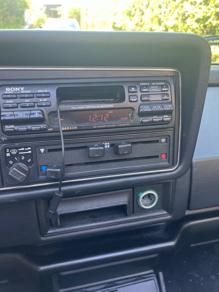 Jetzt probiere ich eine Bluetoothadaptercassette. Funktioniert super, super simpel, mit Freusprechen: Nachteil: Muss geladen werden und das Kabel hängt raus.