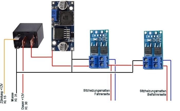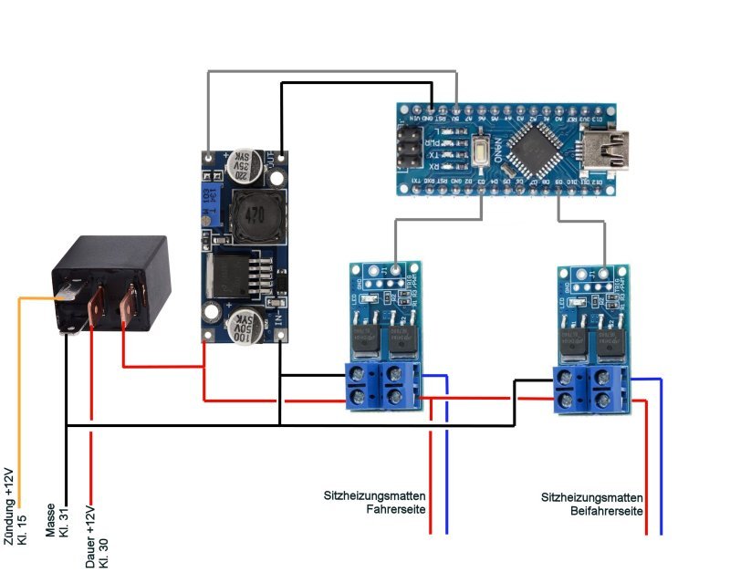 Da diese Box recht aufwändig zu bauen ist und aus vielen, diskreten Bauteilen zusammen gelötet werden muss, hatte ich vor einiger Zeit die Idee eine neue, moderne Version davon zu entwerfen, die aus modularen Bauteilen besteht, einfacher aufzubauen ist und kein Umlöten des Sitzheizungsschalters mehr erfordert. Wir leben schließlich heute in einer Welt günstiger kleiner Mikrocontroller und fertig erhältlichen Modulen für Laststeuerung, Sensorik etc.
