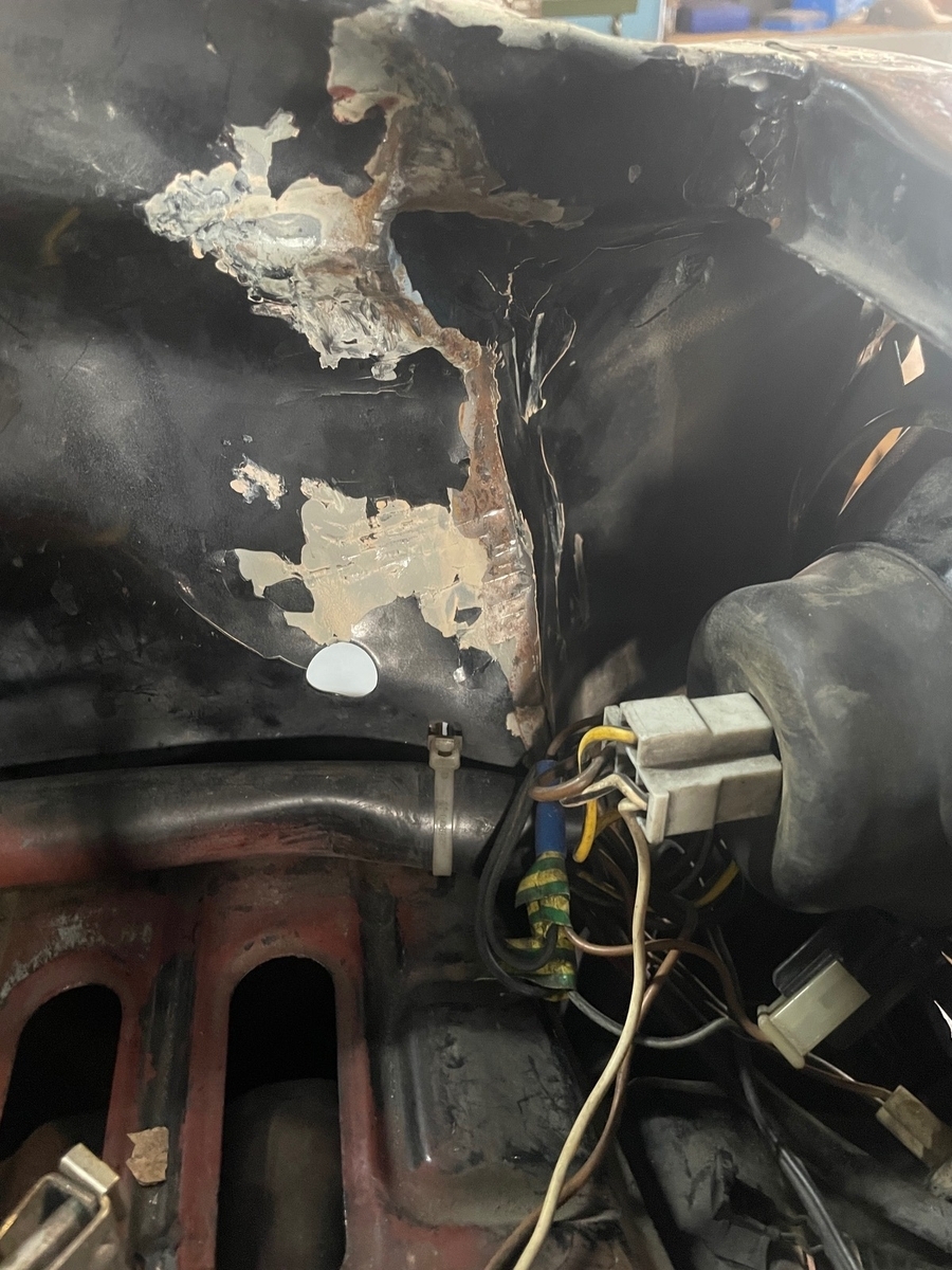 Kingt so, als wenn der Kotflügel beim Abbau aus der Dichtmasse gerissen wurde und der Schraubflansch zur A-Säule jetzt krumm ist. Dazu kann auch noch alte Restdichtmasse an der A-Säule kleben.
