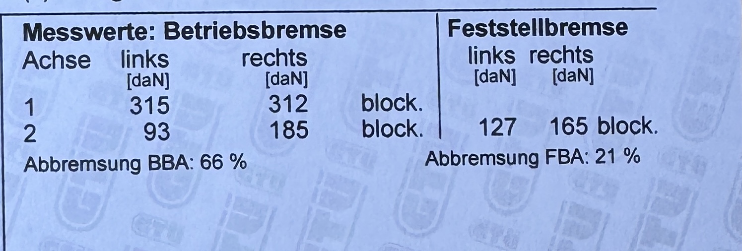 Bis zu diesem Zeitpunkt hatte ich nie Probleme mit den Werten, beidseitig war die Betriebsbremse immer um die 120 daN.