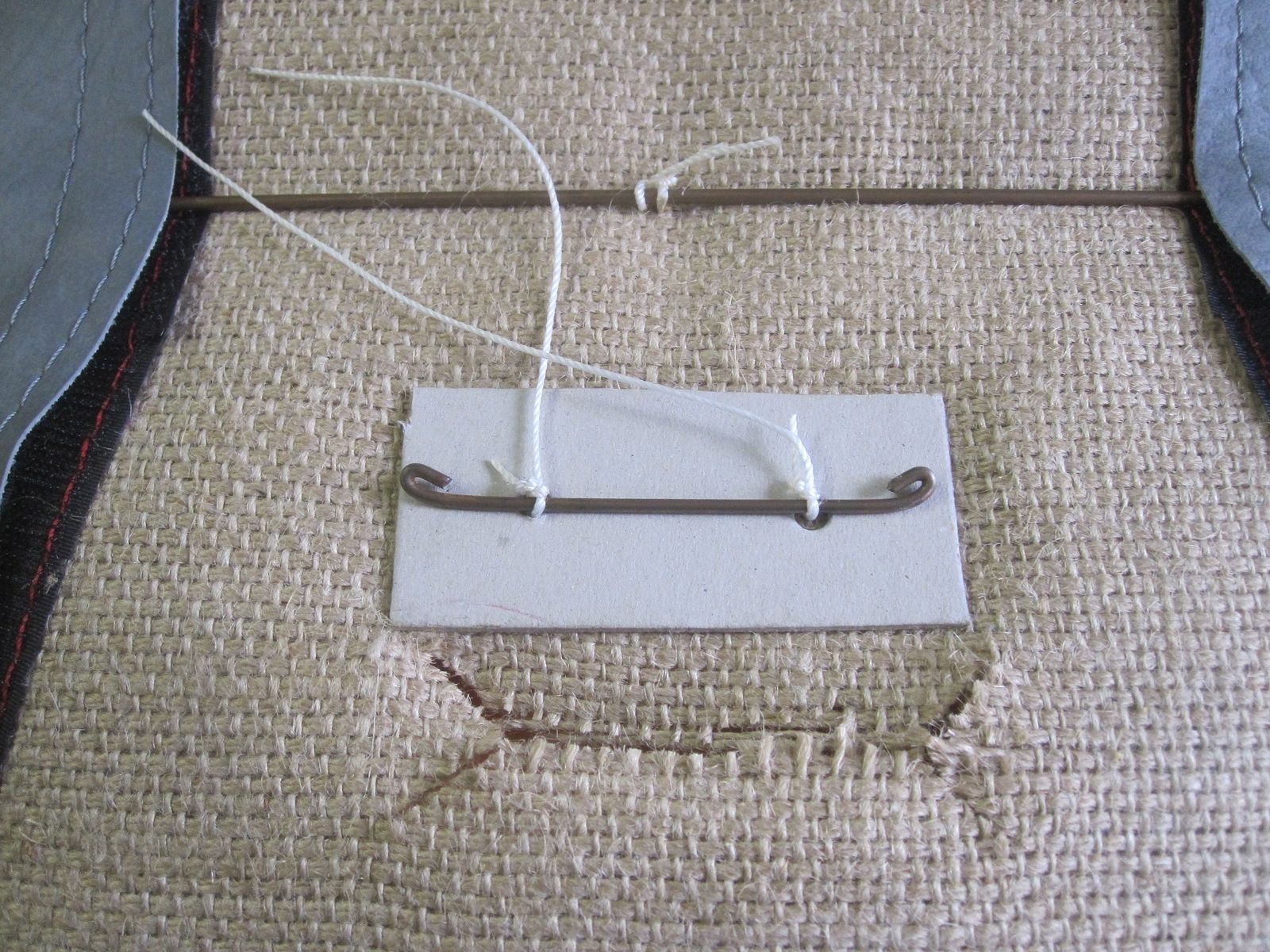 Für die Befestigung des Polsters am Gestell habe ich einen Draht in Federleinen eingenäht und diesen festgeklammert,