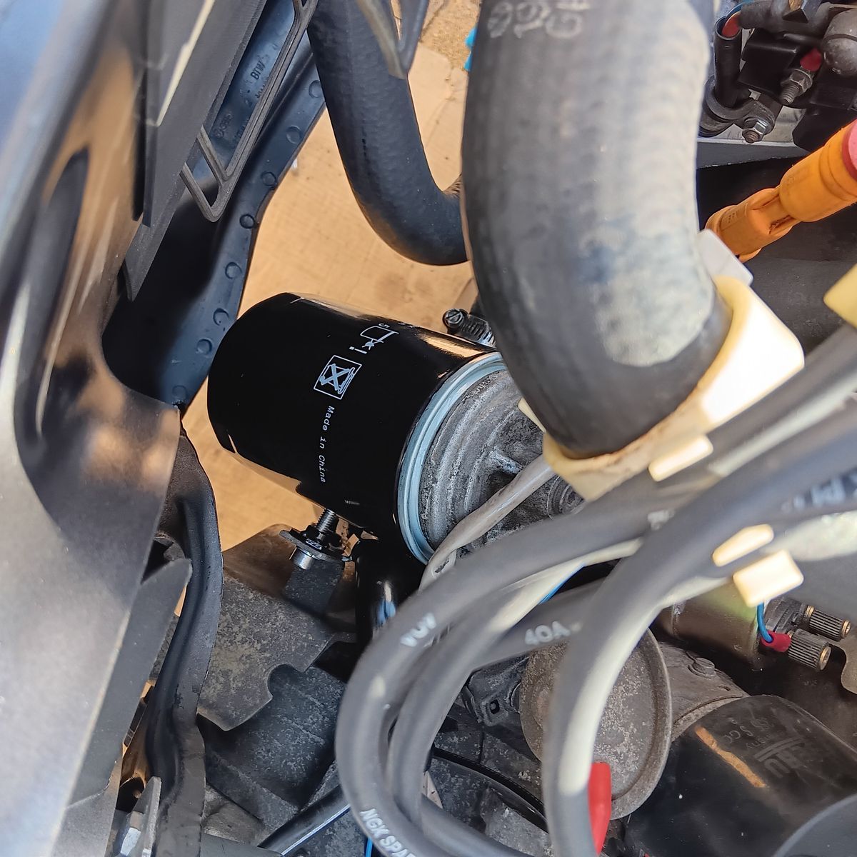 Ich sehe, dass du den Wasser-/Ölkühler entfernt hast. Ich bin den umgekehrten Weg gegangen und habe den Originalkühler durch einen größeren ersetzt, der etwa doppelt so groß ist. Ich kann keinen größeren Filter einbauen, da ich keinen Platz dafür habe.