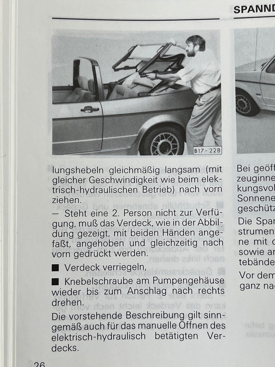 Mein Verdeck ist ausgeschaltet seitdem ich das Auto bei mir ist. Beim misslungenen Versuch es neu beziehen zu lassen in Osnabrück, hat Jörg Dilge den Hebel einfach umgelegt und ich den Knopf gedrückt.