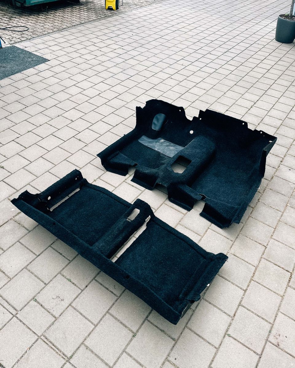 Mehr Details erspare ich Euch. Das Auto stand wohl jahrelang mit löchrigem Verdeck draußen, bevor es in eine Halle wanderte und dann nochmal zehn Jahre stand. Trocken, immerhin. Bewaffnet mit Maske und Handschuhen und ner Menge Schimmelreiniger habe ich den Innenraum grob gereinigt, dann ausgebaut und bewertet: Die meisten Textilien waren nicht betroffen, Sonnenblenden und Gurte dafür sehr. Der Teppich sah auch unbrauchbar aus, den Rest habe ich aufwändig mit Schimmelreiniger, Essig und anderem scharfen Zeug bearbeitet. Während besagte Sonneblenden, Gurte und andere Teile rausflogen, gab ich dem Teppich noch eine zweite Chance: