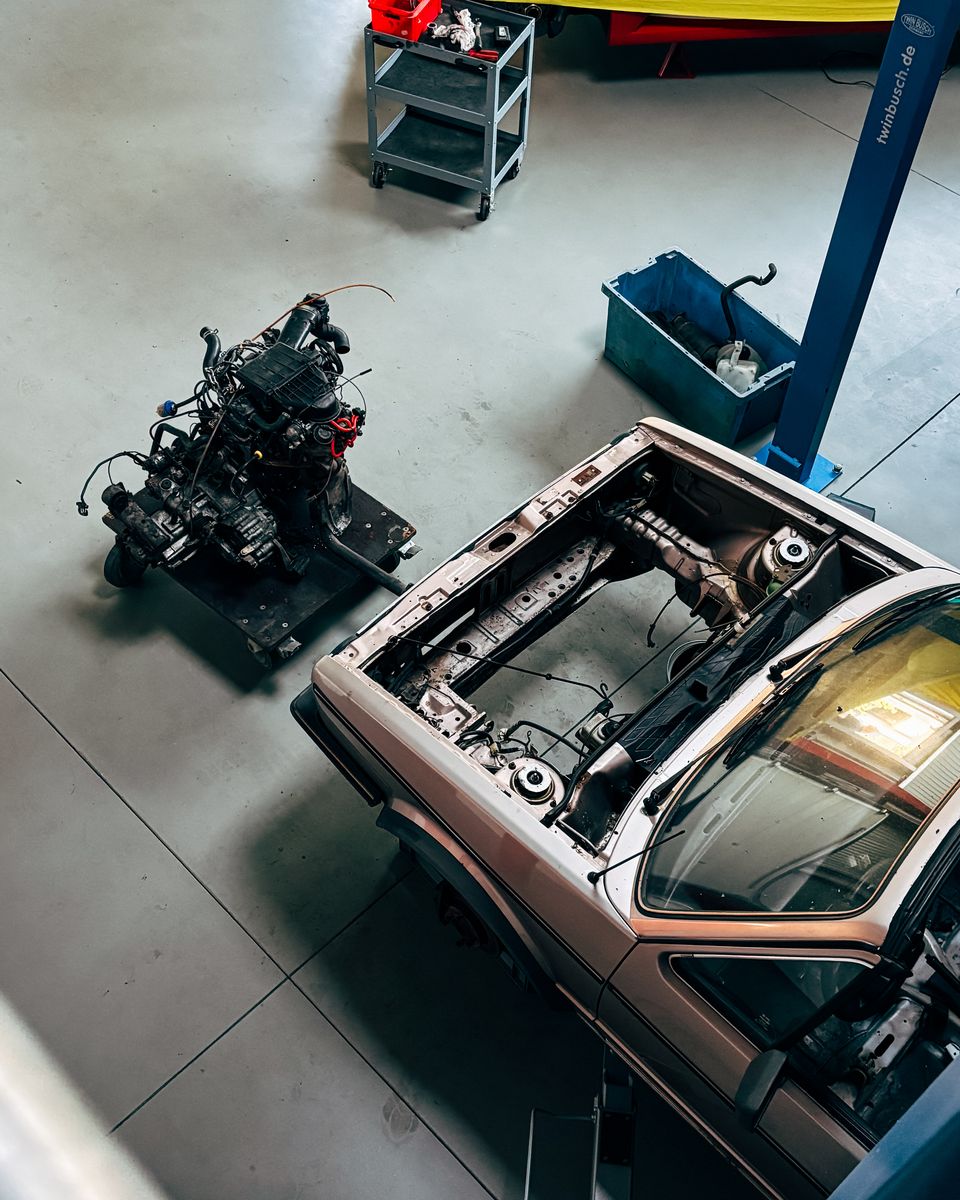 Zeitspung, drei Monate später: Ich hatte endlich wieder ein bisschen planbare Zeit für den Golf über, und fand prompt einen geeigneten Spender: Einen EX von 88, den ich noch unter eigener Kraft fahren sehen konnte. Von ihm habe ich Motor, Getriebe (Fünfgang statt 4+E!), Kühler, Motorkabelbaum, Zentralelektrik, Tacho und Schaltgestänge (meins ist auch fest) erworben:Der aktuelle Stand, von gestern! Ich warte noch auf die frischen Motorlager, Dichtungen und andere Kleinteile für nen kleinen Service, so lange er noch draußen hängt. Habe mir frei genommen bis Freitag - hoffentlich kann ich diese Woche schon ne kleine Probefahrt auf dem Hof machen!
