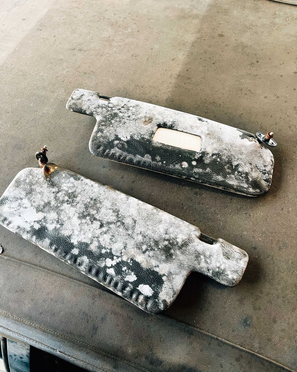 Mehr Details erspare ich Euch. Das Auto stand wohl jahrelang mit löchrigem Verdeck draußen, bevor es in eine Halle wanderte und dann nochmal zehn Jahre stand. Trocken, immerhin. Bewaffnet mit Maske und Handschuhen und ner Menge Schimmelreiniger habe ich den Innenraum grob gereinigt, dann ausgebaut und bewertet: Die meisten Textilien waren nicht betroffen, Sonnenblenden und Gurte dafür sehr. Der Teppich sah auch unbrauchbar aus, den Rest habe ich aufwändig mit Schimmelreiniger, Essig und anderem scharfen Zeug bearbeitet. Während besagte Sonneblenden, Gurte und andere Teile rausflogen, gab ich dem Teppich noch eine zweite Chance: