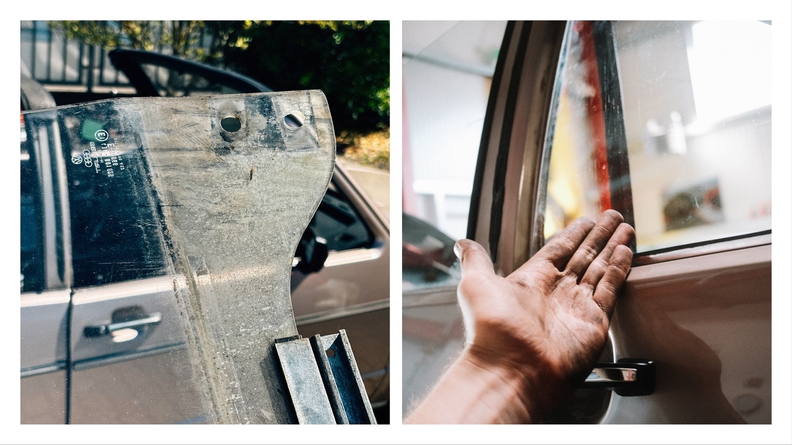 Ins Reinigen der Fenster habe ich knapp zwei Stunden gesteckt. Der oberflächliche Schmodder ging gut ab, aber insbesondere auf der Beifahrerseite hat sich so viel hartes Zeug festgesetzt, dass ich beim Drüberstreichen mit der Hand das Meer rauschen hören konnte. Erstaunliche zweieinhalb Stunden habe ich aufs Wienern mit Feinpolitur verwendet, das war ziemlich therapeutisch. Im Eingebauten Zustand waren sie natürlich wieder voller Schmiere vom Dichtungseinbau, aber selbst damit sahen sie mehr nach nem normalen Auto aus als nach einem Scheunenfund: