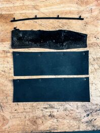 Meine Luftdruck-Ausgleichsmatte (singular) in der Tür war in miesem Zustand, aber weil grade Sonntag war, konnte ich nicht mal eben zum Baumarkt fahren und mir dort irgendwas passendes suchen. Stattdessen habe ich einfach ein Stück aus der Außenhaut des ursprünglichen Verdecks geschnitten, das erfreulicherweise noch immer im Schrott-Lager hinterm Haus lag. Und im Kleinkram-Archiv waren genug kleine Plastikclips, um die eine fehlende Clip-Leiste zu ersetzen: