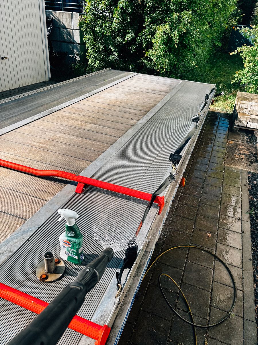 Morgen können die Gurte wieder rein. Ich hatte die originalen nach dem Ausbau vor einem Jahr schon mal intensivgereinigt, und auch nach einem Jahr in meinem feuchten Schuppen zeigte sich kein neuer Schimmel. Weil ich die (besser erhaltenen) Vordersitzgurte aus dem penderfahrzeug von Motor und Getriebe noch nicht gereinigt hatte, habe ich das Prozedere einfach nochmal wiederholt. Bis morgen Mittag sind die Gurte zuverlässig trocken, dank des praktischen Hängers in der Sonne. Ich bin inzwischen bei meiner vierten Flasche Schimmelreiniger angekommen.
