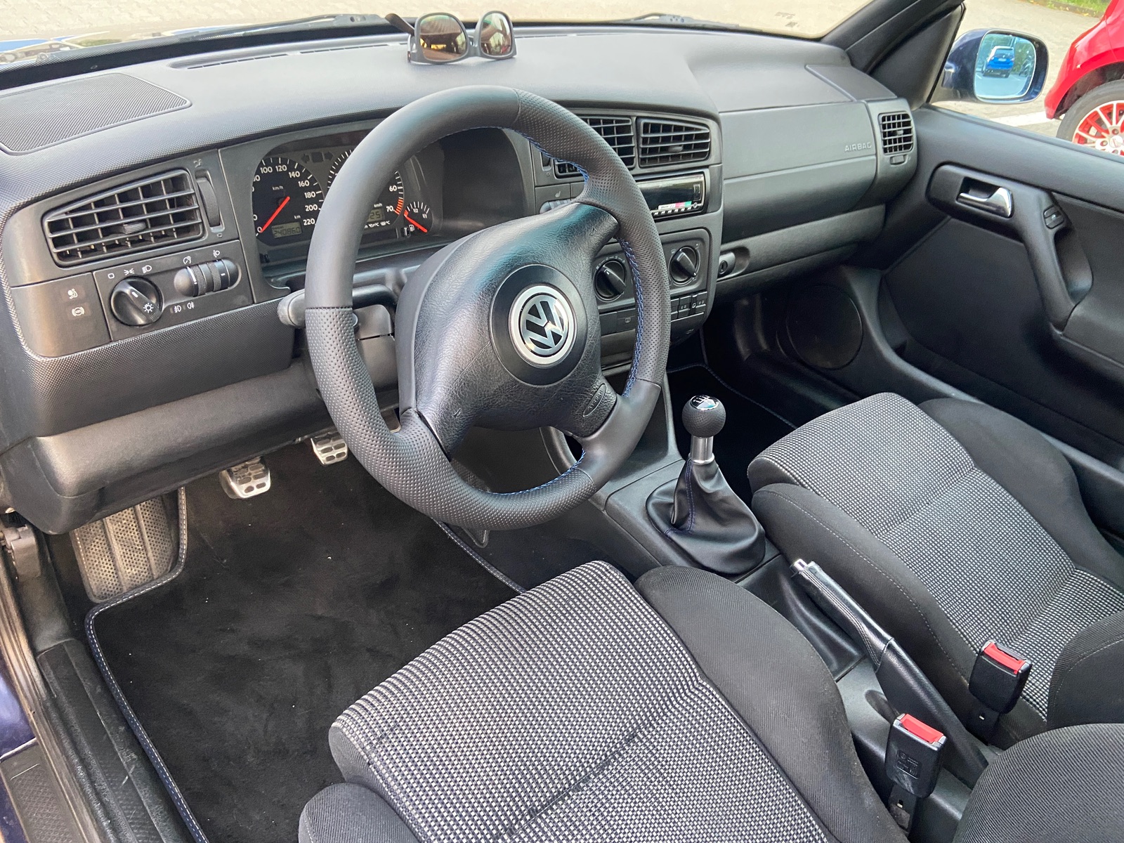 Zwischen dem 4 und 5 Besitzer stand das Cabrio wohl längere Zeit (2 Jahre), leider nicht trocken (der Dreck sieht nach aktiv genutzer Scheune aus) - ich habe die ersten 3 Tage nur mit Reingung des Innenraums verbracht! Die Türgriffe habe ich mittels Nagellackreiniger vom klebrigen Softlack befreit (draunter sehen sie jetzt aus wie neu), die Sitze wurden 6 Stunden lang mit dem Nass Trocken Sauger beabeitet, Schalhebel und Fussmatten kamen direkt neu (blaue bzw. grau blaue Naht) und das Lenkrad habe ich ebenfalls durch ein neu beldertes (Loch/ Glattleder Napa mit blauer Naht) ersetzt. Somit ist alles was man anfasst wieder "neu". Achja, ein paar TT Pedalauflagen gabs auch noch.