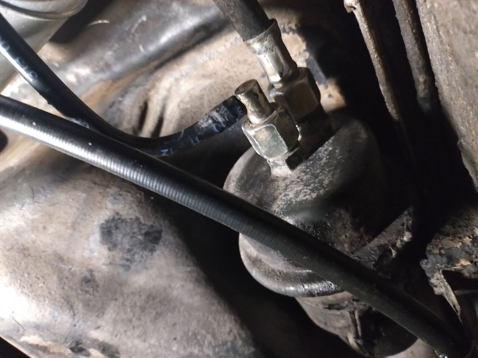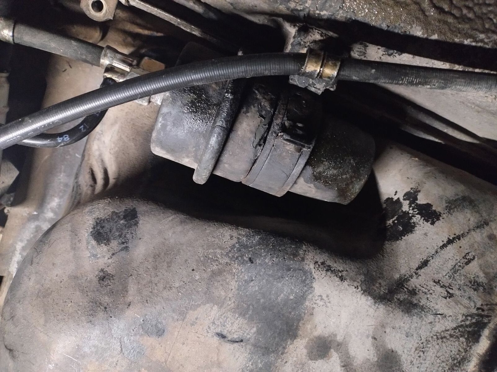 Die Leitung von der Benzinpumpe zum Druckspeicher scheint undicht zu sein, oder auch die daneben. Der Druckspeicher ist