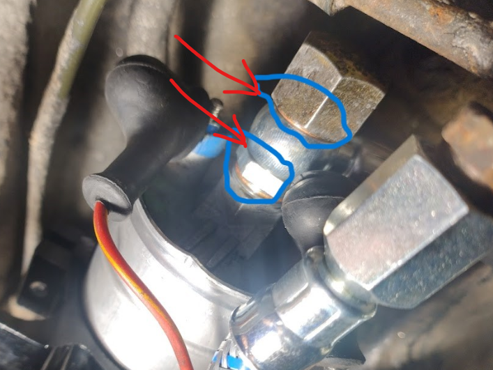 Leider sind 2 Stellen (siehe blaue Kringel auf dem Foto) an der KRaftstoffpumpe undicht. :wut: Erst habe ich das Ende der Pumpe noch etwas nachgezogen.
