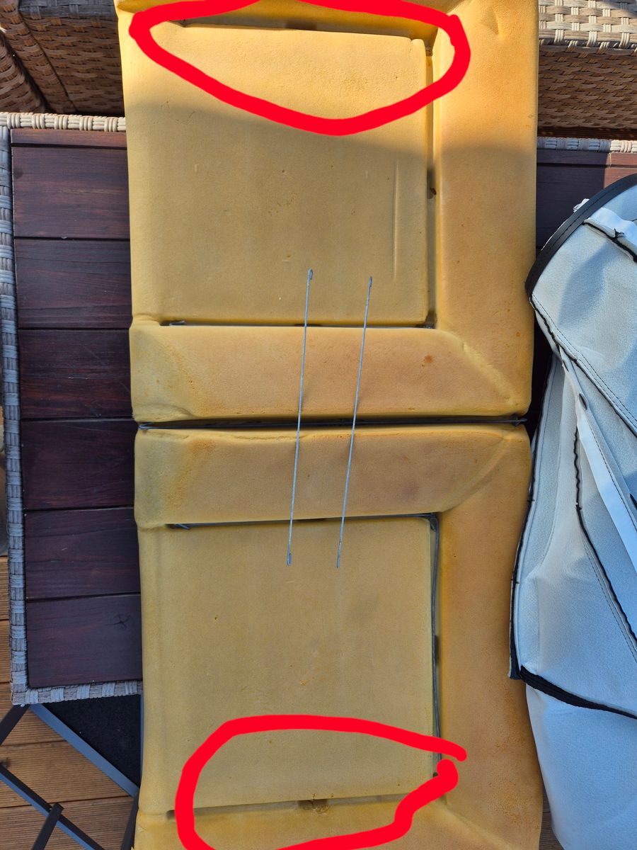 ich habe neue Sitzbezüge bekommen und habe nun ein kleines Durcheinander. Es war alles auseinander gebaut und beschriftet und jetzt habe ich trotzdem ein Problem bei der Rückenlehne. Ich weiß nicht, welche Spanndrähte an die beiden äußeren markierte Stellen kommen. Vielleicht könnt ihr mir da helfen