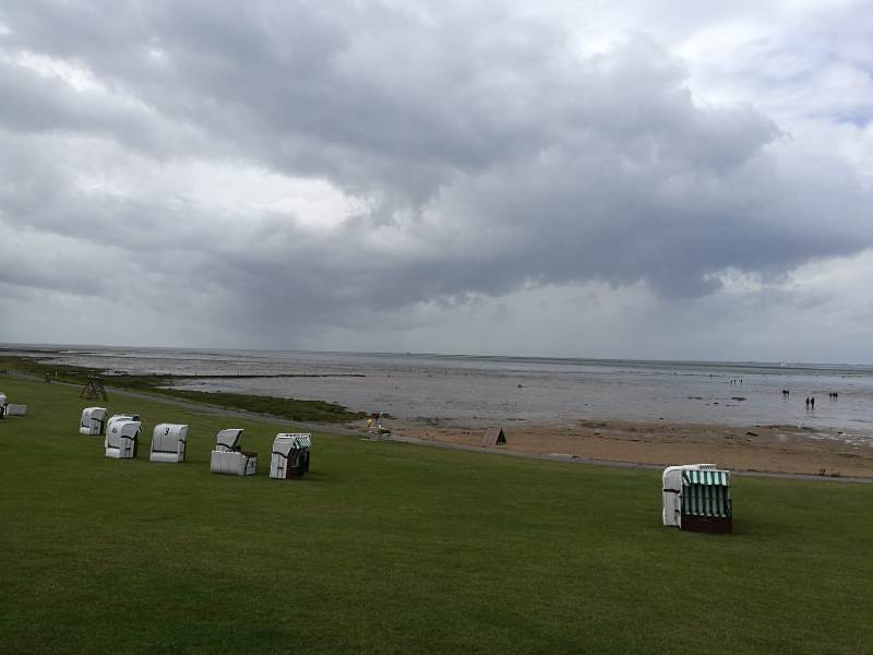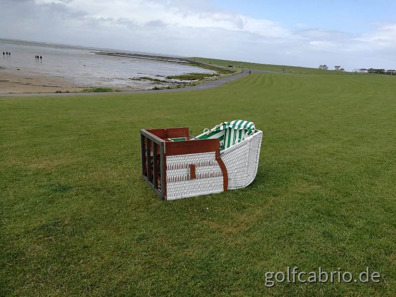 Auf dem Weg nach Nordstrand mussten wir dann doch „alarmmäßig“ die Dächer schließen ,- Wolkenbruch! Auf dem Nordstrander Damm war nur noch langsames Fahren mit Scheibenwischer auf Stufe 3 möglich .. 3 Km weiter war das wieder erledigt und wir haben Nordstrand erreicht.