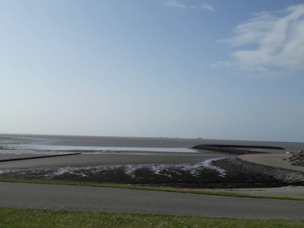 Unsere Strecke führt uns einmal um die Insel, dicht am Deich entlang. An der Badestelle „Westen“ angekommen, riskieren wir einen Blick über den Deich.