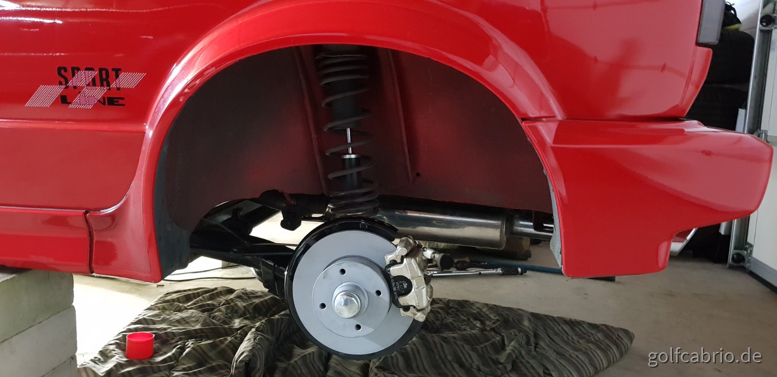 Seit 3 Jahren bin ich dabei mir eine 16V Scirocco-Hinterachse mit Scheibenbremsen um großen Stabi aufzubauen, die ich jetzt nach langem überlegen auch eingebaut habe. Bei der Aktion habe ich auch gleich vorne die ganze Aufhängung neu gemacht. Die Tipps und Tricks habe ich alle aus dem Forum - Danke.