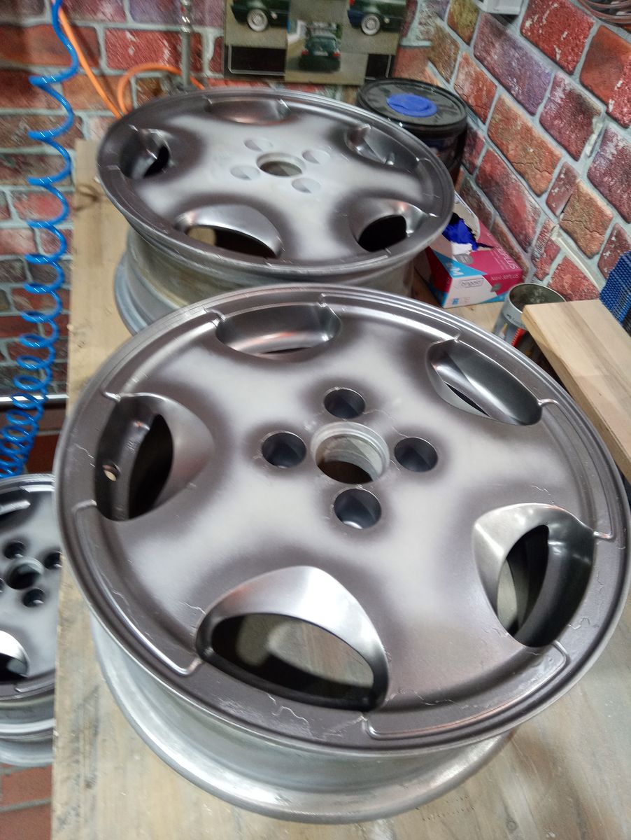 Jetzt hau ich noch 2 fette Schichten Klarlack drauf - dann sollten sich die 50 € Felgen schon irgendwie sehen lassen können :D