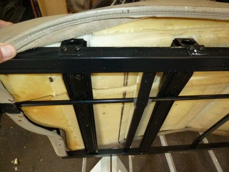 Die Kopfstützen selbst passen aus keinem anderen Fahrzeug, weil der Winkel viel zu flach ist. Man muss also die Führung - Stange der Kopfstütze gefühlvoll im Schraubstock steiler stellen, exakt, so dass die Heckscheibe beim Öffnen noch vorbeigeht, aber die Kopfstütze nicht so weit vor dem Genick steht…. Passende Bezüge hatte ich mir in Osnabrück in Kunstleder für mein Classic line machen lassen.