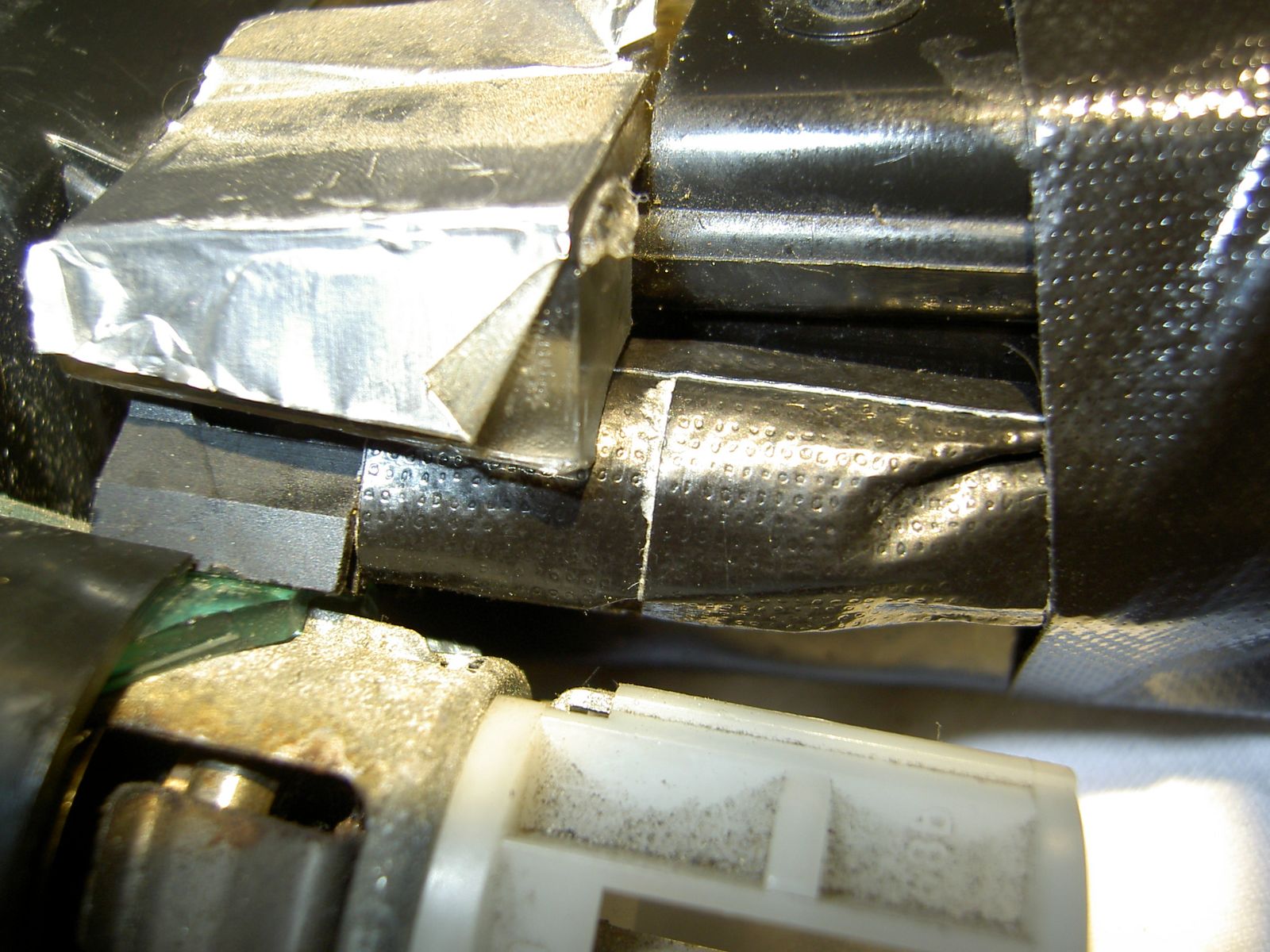 Lampe ins Lampen-Kopfteil eingeschoben, dabei die nun überflüssig gewordene Messing-Kontaktplatte entfernt - Kopf eingeschrumpft - Panzerband drum - feddich: