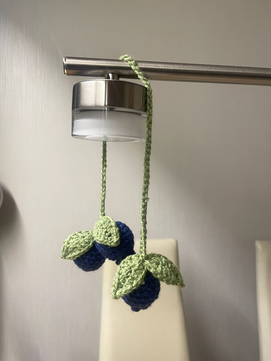 Bei uns wird das jazzblaue G3C CC auch "Blaubeerkörbchen" genannt, schon alleine um den Unterschied zum richtigen Erdbeerkörbchen (dem roten G1C) herzustellen. Leider hat Ewa nur rote Erdbeeren in Ihrem Häckelangebot, so daß mir Katrin im Winter nun diese Blaubeeren für den Innenspiegel angefertigt hat. Wenn schon, dann aber richtig. Hängen leider aber aktuell noch an der Lampe vom Esstisch, wird sich aber ändern: