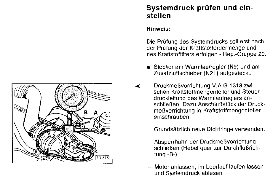 Der Systemdruck sollte 4,7 bis 5,4 Bar betragen. Ohne Motorlauf ist keine richtige Messung möglich.