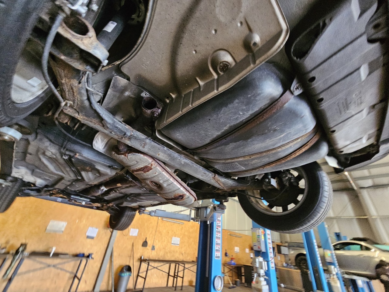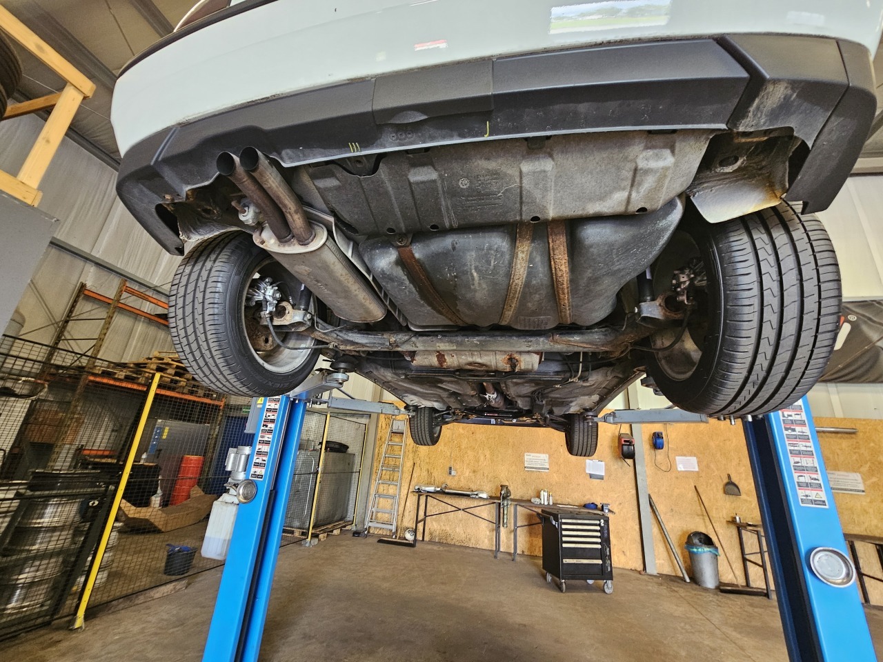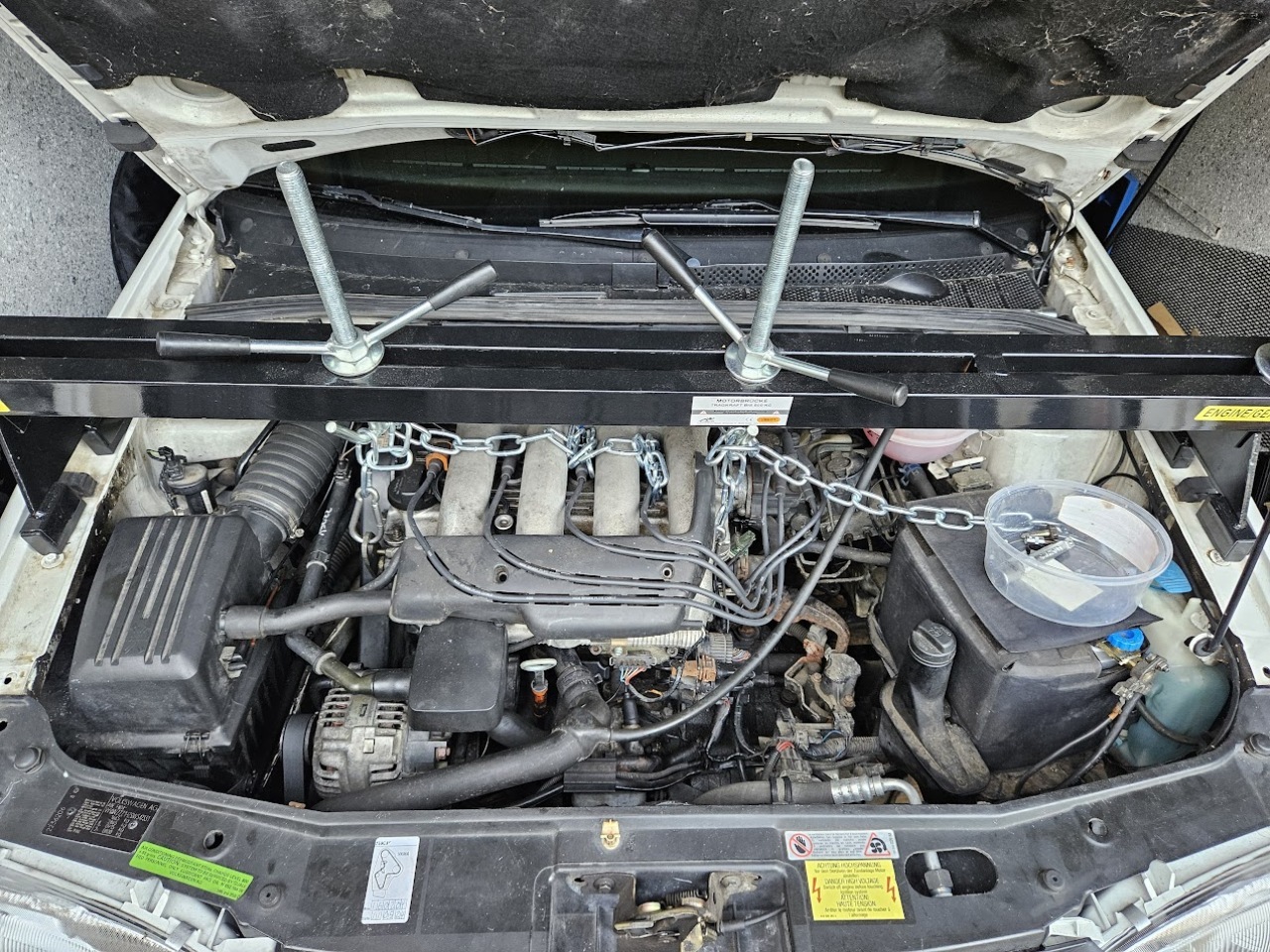 Mir ist bewusst, dass ich das Auto vorne an den falschen Stellen angehoben habe, allerdings sind die Bühnenarme für die eigentliche Stelle zu kurz und mit einem dicken Stück Schaumgummi und der Gewissheit, dass das Blech an der Stelle neu und tragfähig ist, kann man das m.E. tatsächlich so machen...