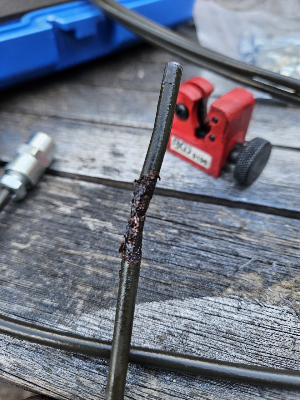Jo...Bremsleitung geplatzt...im Halter aufgerostet und durch, sah eigentlich sehr gut noch aus.