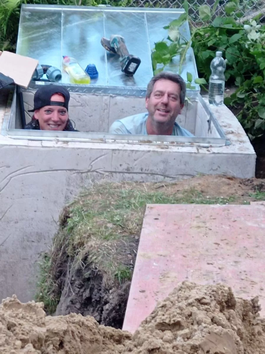 Nun beginnen die Tunnelarbeiten für die anderen 34 Gärten . Die Gräben sind gezogen, gesten wurde der Kanalanschluss geschaffen .... Leider auch 2,30m tief .... und der Bagger hat nicht alles freilegen können, sodaß von Hand ein kleiner Tunnelvortrib bis zur nächsten Tonrohrmuffe geschaffen wurde.......Geht nicht gibts nicht.....